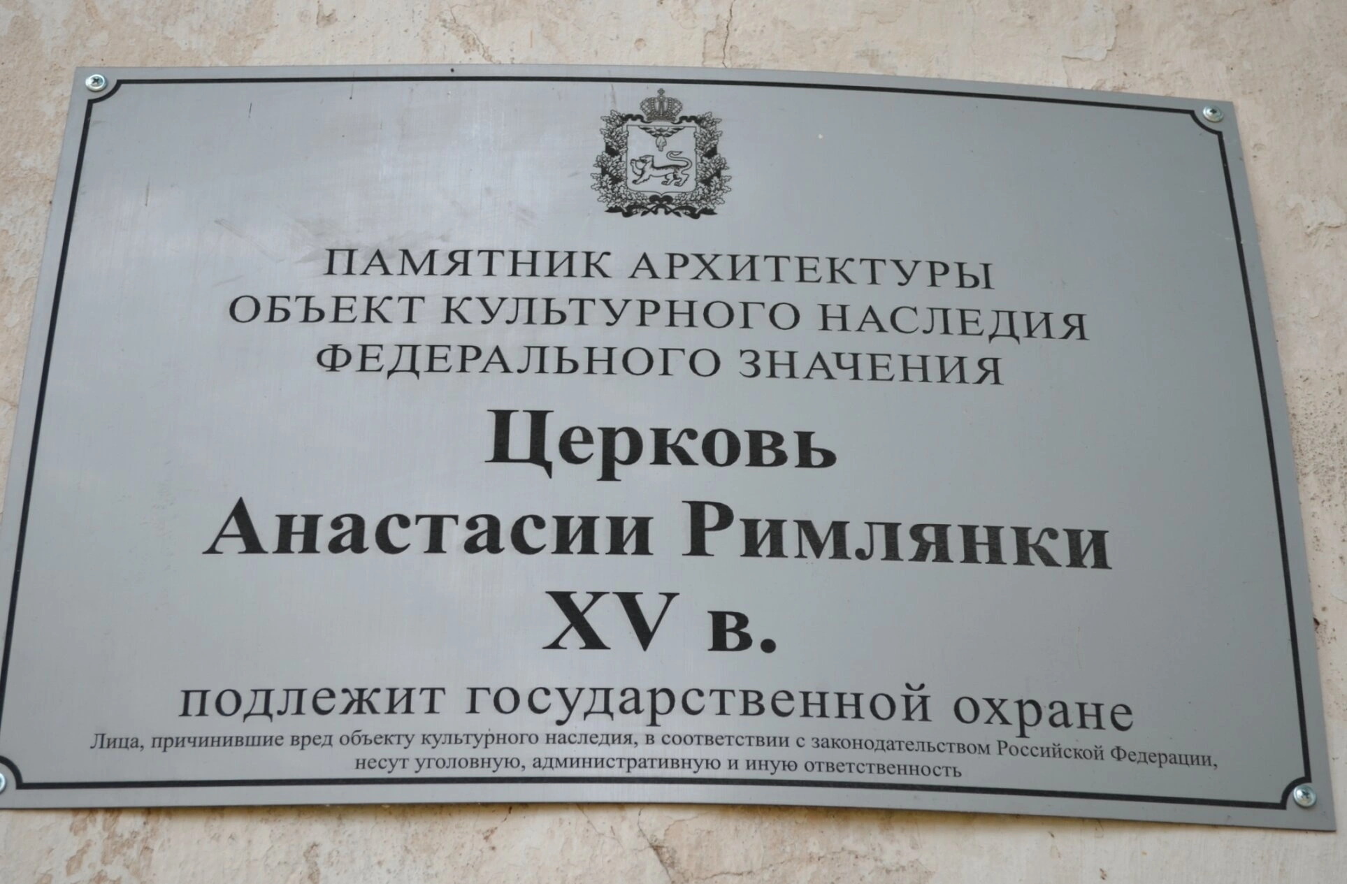 Текст на табличке чётко определяет правовой статус святыни: «ПАМЯТНИК АРХИТЕКТУРЫ», «ОБЪЕКТ КУЛЬТУРНОГО НАСЛЕДИЯ ФЕДЕРАЛЬНОГО ЗНАЧЕНИЯ», «Церковь Анастасии Римлянки XV в.», «подлежит государственной охране». Ниже приведено предупреждение об ответственности за причинение вреда памятнику в соответствии с законодательством Российской Федерации.