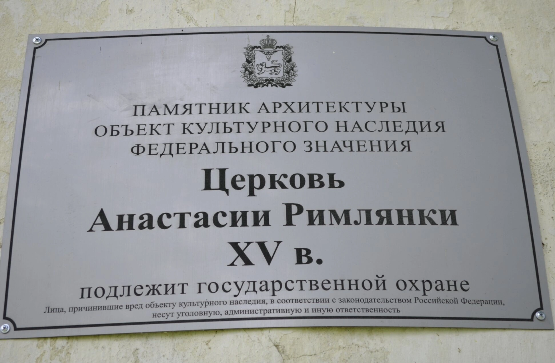 На фотографии запечатлена информационная табличка, установленная на фасаде Церкви Святой Великомученицы Анастасии Узорешительницы в городе Пскове. Данный храм является выдающимся памятником псковской архитектуры и объектом культурного наследия федерального значения, находящимся под государственной охраной. Ответственность за его сохранность установлена законодательством Российской Федерации.