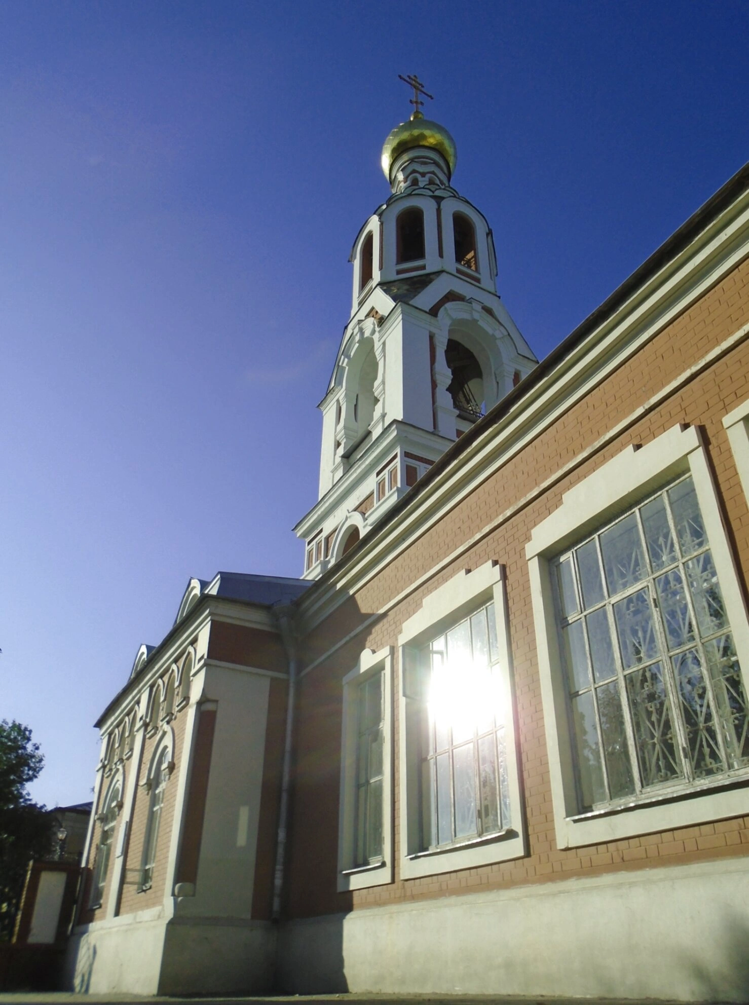 Большие арочные окна, украшенные коваными решетками, характерны для православных храмов и создают особое освещение в интерьере во время богослужений. Яркое солнечное освещение на фотографии выгодно подчеркивает детали кирпичной кладки и декоративных элементов, а чистое голубое небо на заднем плане создает ощущение небесного покрова над домом Божиим.