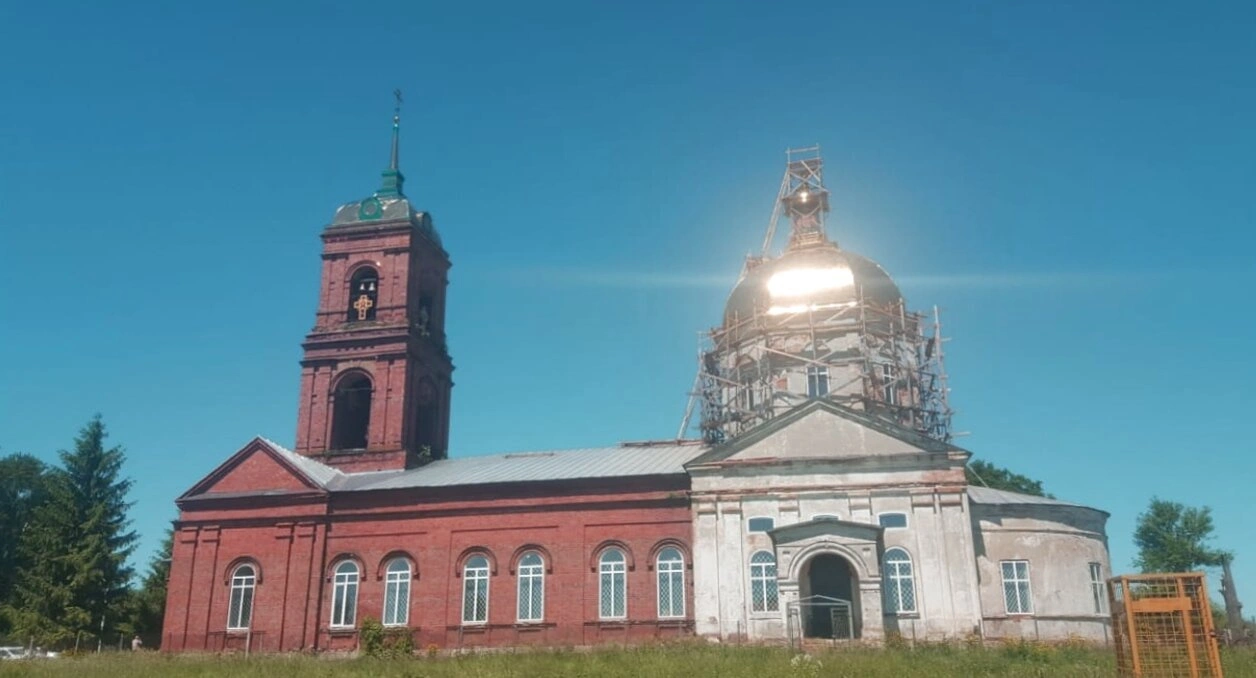 Справа расположено основное здание церкви. Его стены оштукатурены, а фасад украшен рядами арочных окон с белыми наличниками. Над средокрестием храма возносится величественный золотой купол, олицетворяющий небесную славу и Господа Иисуса Христа. В момент съёмки купол и часть стен были окружены строительными лесами, что свидетельствует о ведущихся реставрационных работах по возрождению святыни.