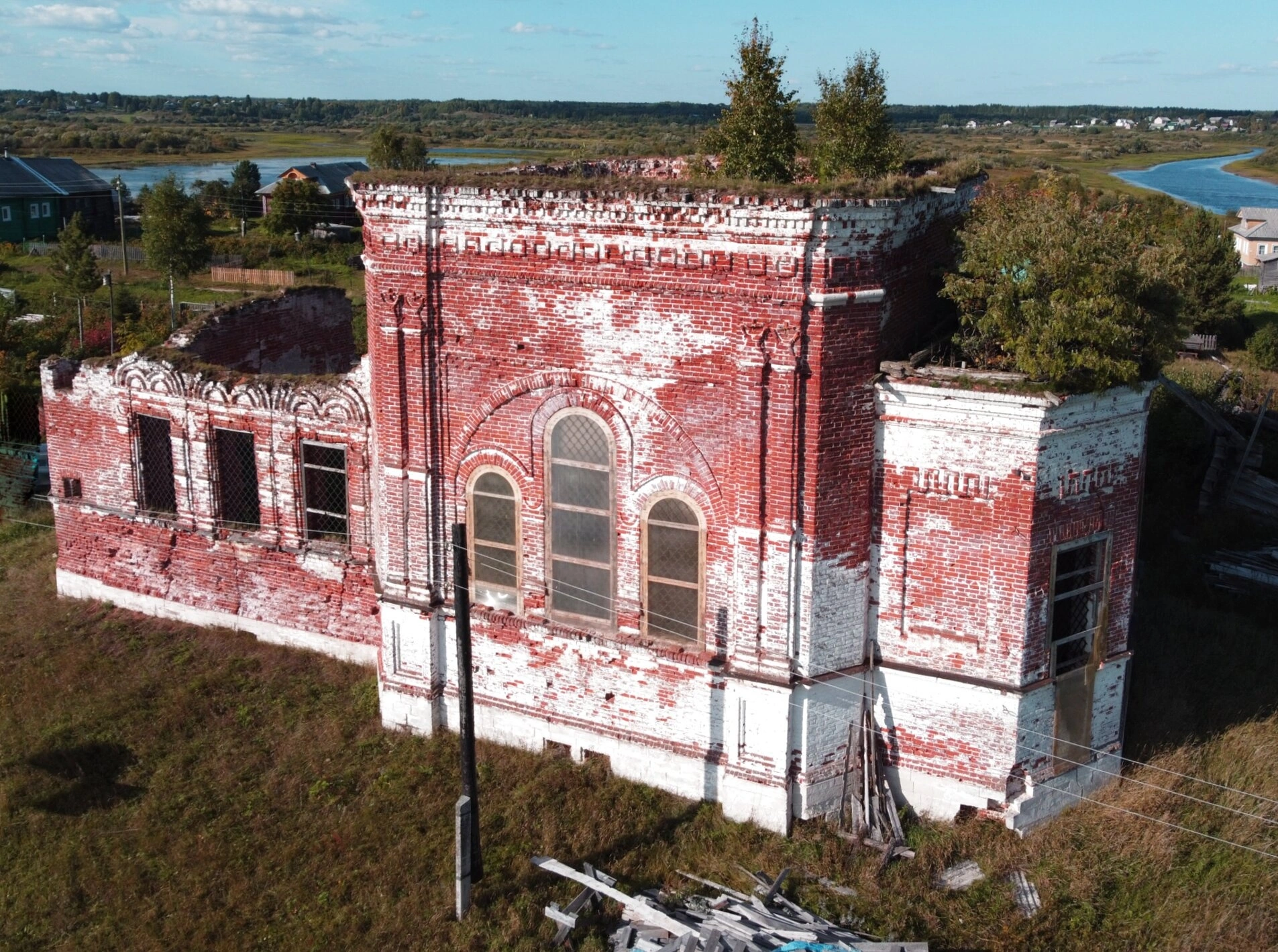 На представленной фотографии запечатлена полуразрушенная церковь во имя святых апостолов Петра и Павла, расположенная в деревне Ратонаволок Холмогорского района Архангельской области. Храм находится на возвышенности вблизи реки, что характерно для традиционного расположения православных святынь Русского Севера.