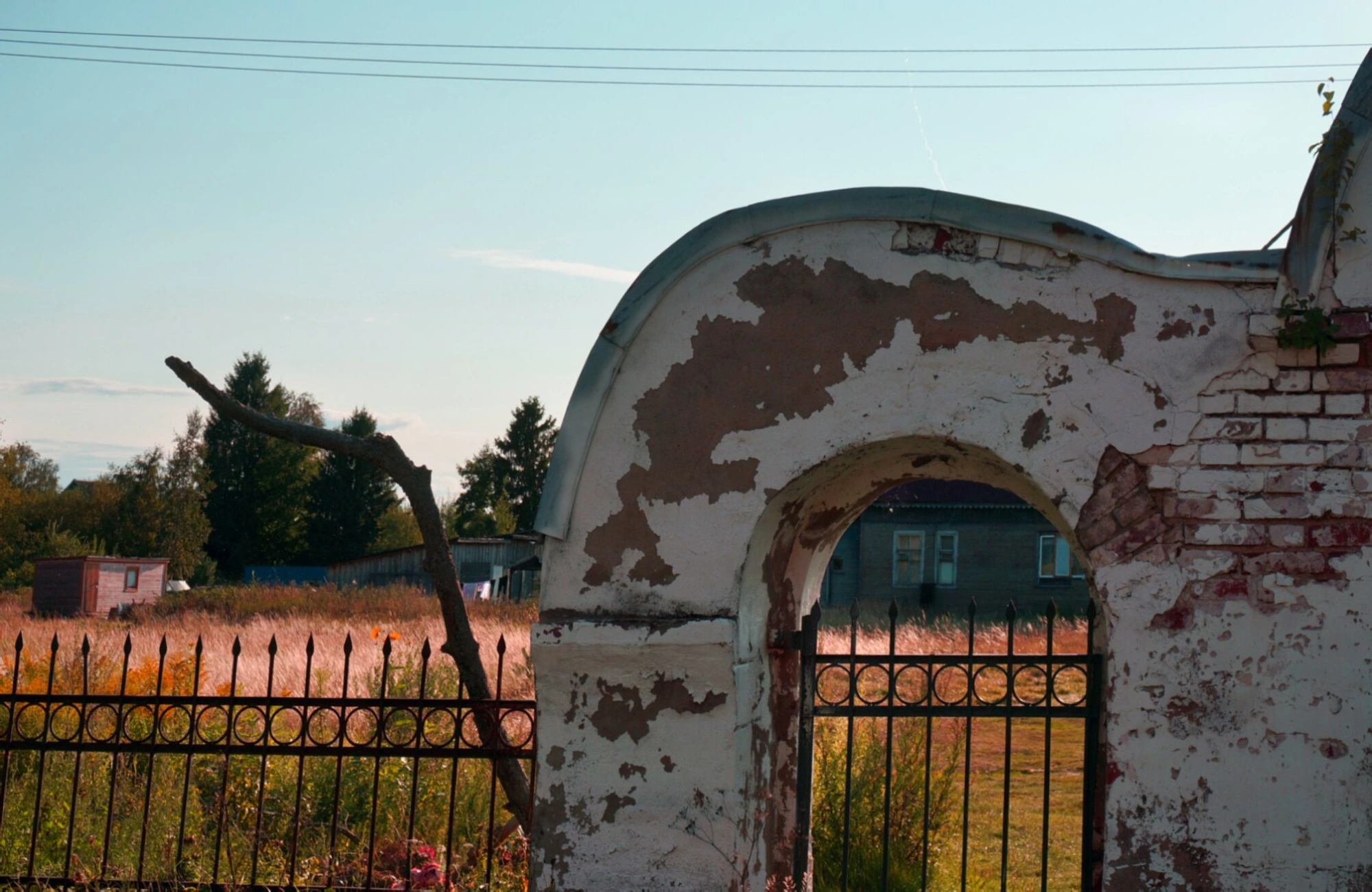 На представленной фотографии запечатлён фрагмент исторического ансамбля церкви Святых Перверховных Апостолов Петра и Павла, что располагается в древнем городе Новая Ладога на берегу реки Волхов. На переднем плане взору открывается старая кирпичная арка, некогда бывшая частью ограды или малых архитектурных форм храмового комплекса. Годы запустения и отсутствия реставрации привели к заметному разрушению: штукатурка осыпалась, обнажив кладку, а краска облупилась. Перед аркой установлен ажурный кованый металлический забор, также несущий на себе печать времени.