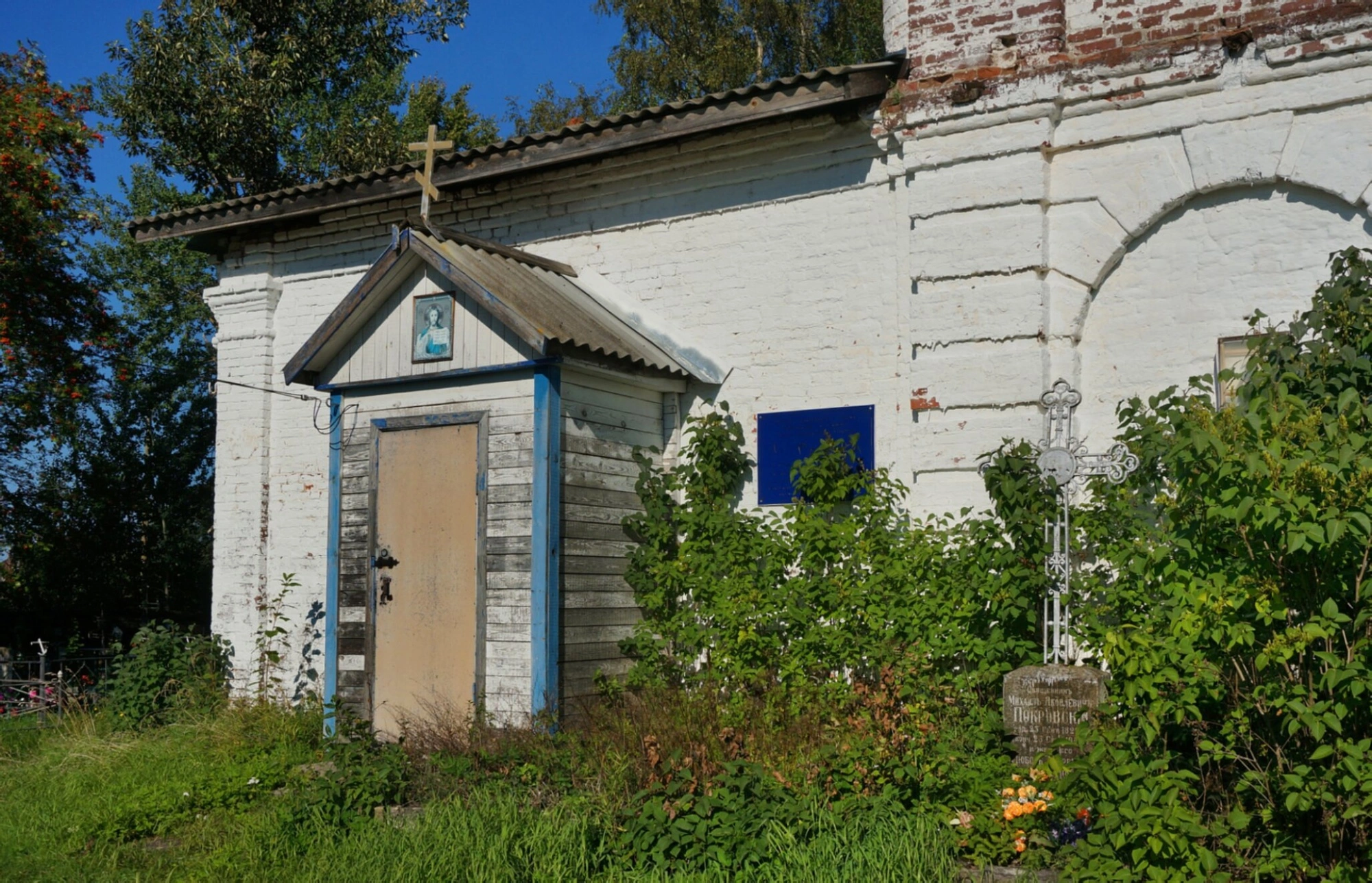 Территория вокруг храма утопает в зелени: густая трава, кустарники и деревья создают естественное обрамление для святыни. С правой стороны от пристройки находится металлический крест на могиле, частично скрытый за растительностью. На могильном кресте различима памятная надпись, вероятно, указывающая на место упокоения служителя храма.