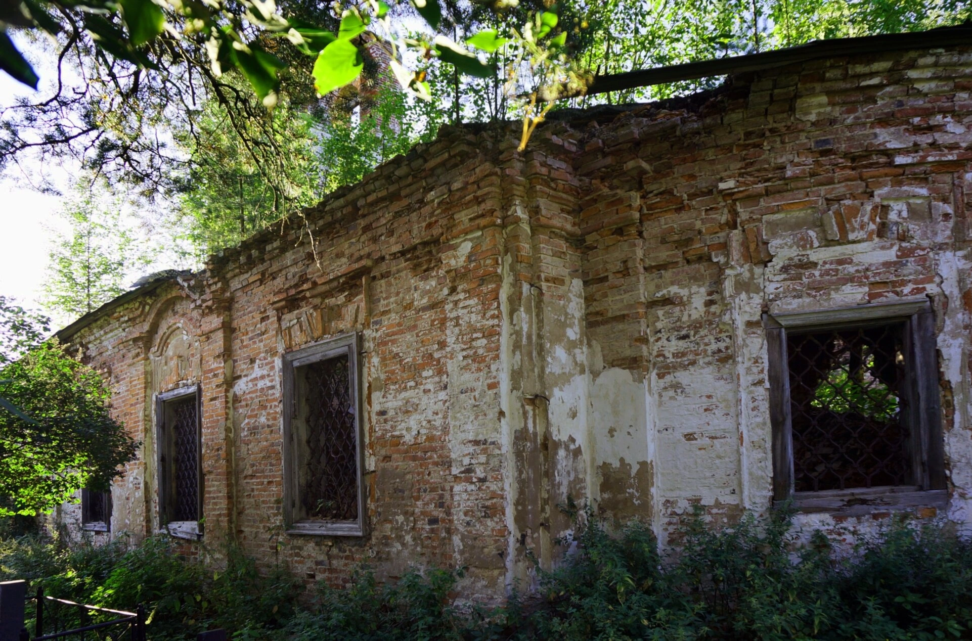 Церковь представляет собой кирпичное здание, выполненное в традициях русской храмовой архитектуры. На снимке видны характерные элементы церковного строения: арочные оконные проёмы, сохранившиеся фрагменты декоративного оформления фасада. Строение демонстрирует следы времени - частичную разрушенность и естественное зарастание растительностью, что придаёт ему особый исторический шарм.