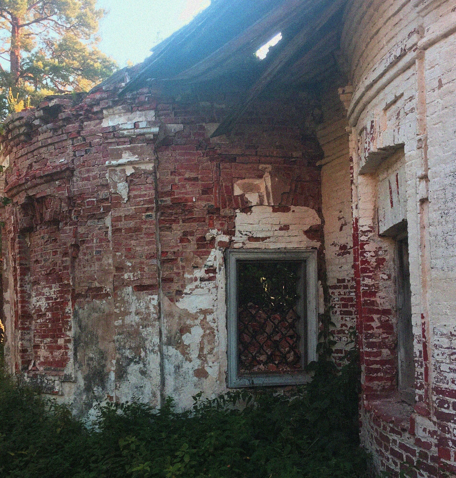 Величественные стены из красного кирпича, некогда возведённые во славу Божию, ныне пребывают в запустении. Лики арочных оконных проёмов, один из которых всё ещё хранит кованую решётку, безмолвно взирают на окружающую их поросль. Своды и кровля храма частично обрушены, обнажая внутреннее пространство и элементы деревянных конструкций, что придаёт всей картине ощущение глубокой скорби.