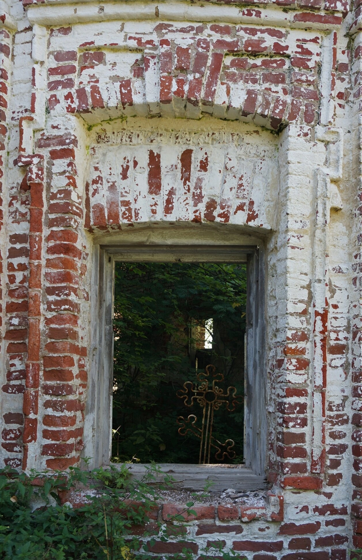 Стена храма сложена из качественного красного кирпича, что свидетельствует о традициях церковного строительства XIX века. Частичное сохранение белой штукатурки на поверхности создаёт особый колорит, подчёркивая историческую ценность святыни. Арочная форма окна соответствует канонам православной архитектуры, символизируя устремлённость к горнему миру.