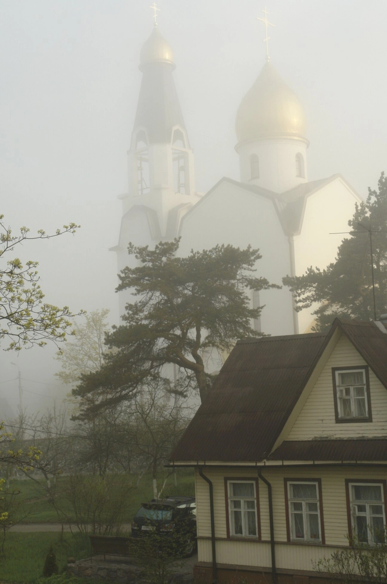 Храм святых апостолов Петра и Павла, построенный в начале XX века, является значимым духовным центром Сестрорецка. В туманной дымке его очертания приобретают особую мягкость, создавая образ небесного града, проявляющегося в земном мире. Отсутствие ярких цветовых контрастов и резких линий способствует созданию молитвенной атмосферы, напоминая о божественном свете, проникающем сквозь покров земной реальности.