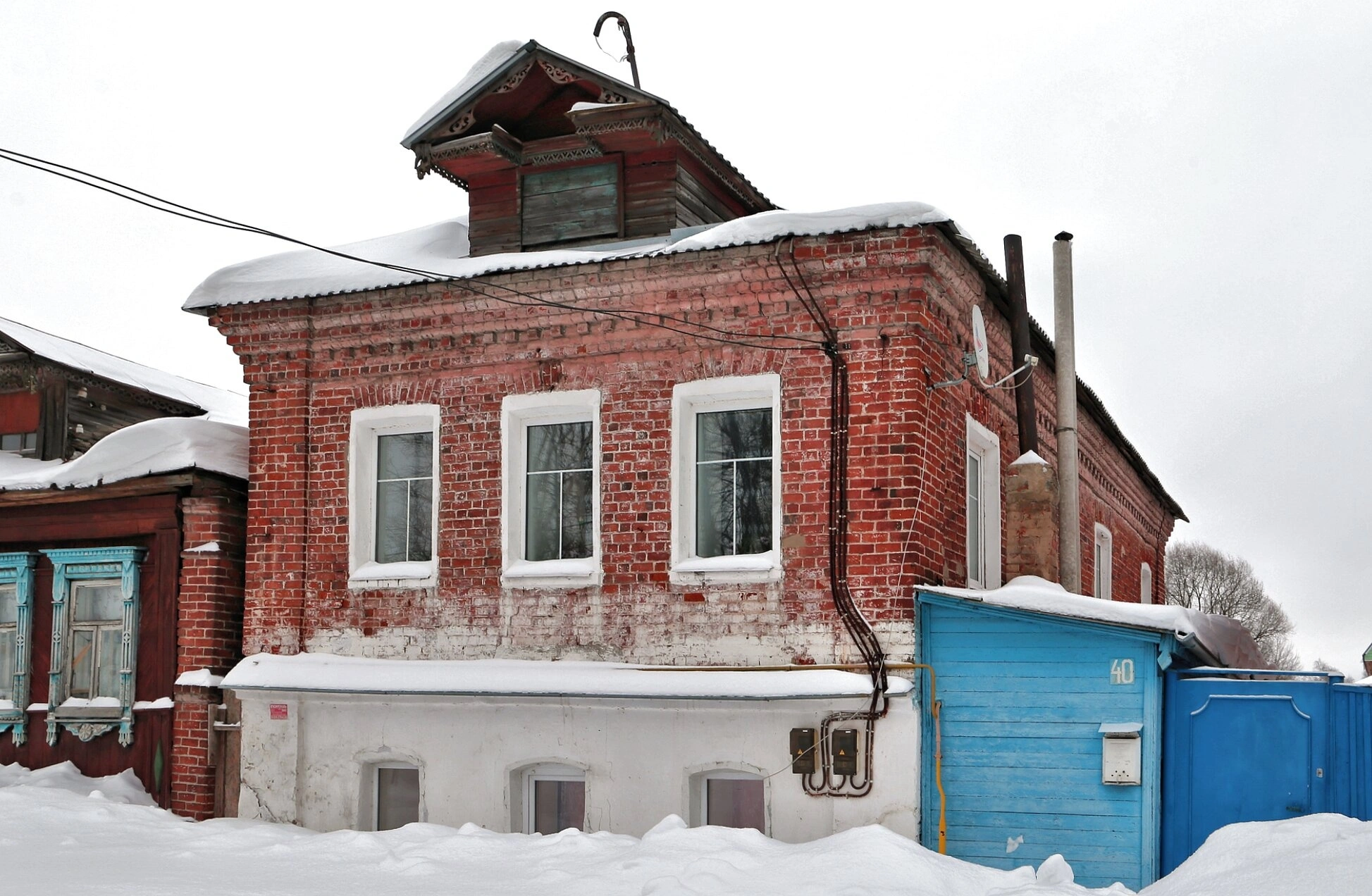 Крыша храма частично выполнена из дерева и украшена резными элементами, что свидетельствует о внимании к деталям при строительстве домов Божиих. Рядом с основным объемом находится пристройка, обшитая синими деревянными досками, с табличкой, указывающей номер дома «40».