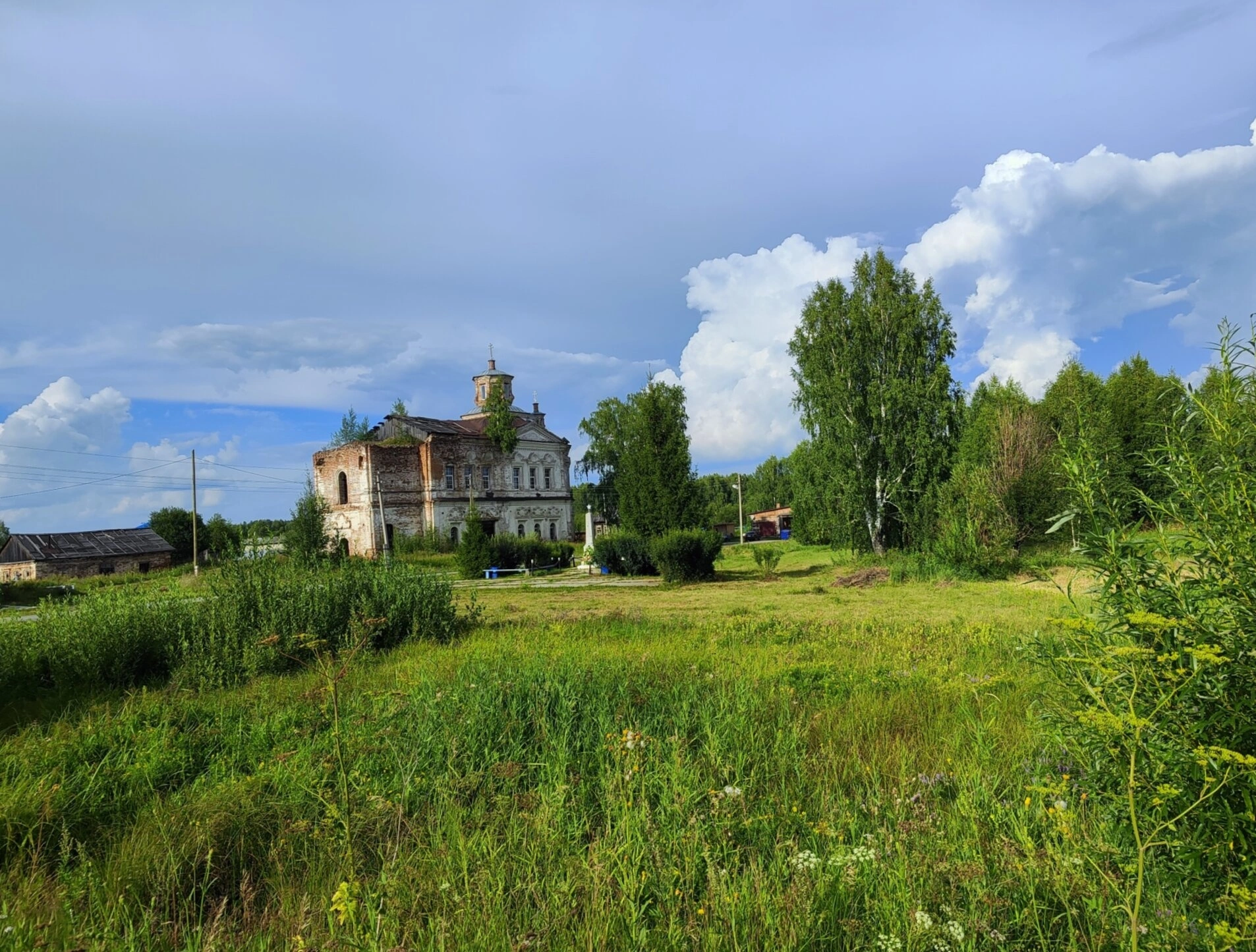 На представленной фотографии запечатлена Церковь Святых Апостолов Петра и Павла, расположенная в селе Усть-Салда Верхотурского района Свердловской области. Храм находится в полуразрушенном состоянии, что придает ему особую духовную значимость как памятника истории и православной культуры Урала.