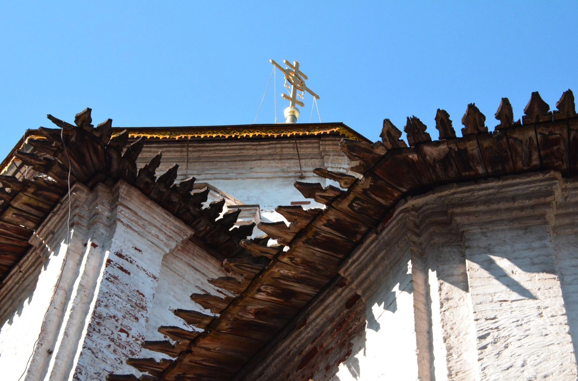 На представленной фотографии запечатлён фрагмент кровли и главы старинного православного храма во имя святых благоверных князей-страстотерпцев Бориса и Глеба, что расположен в историческом районе Затьмачье города Твери. Снимок позволяет детально рассмотреть архитектурные элементы завершения церкви: мощный световой барабан, увенчанный шлемовидным золочёным куполом и традиционным православным крестом, а также более низкие декоративные главки, покрытые чешуйчатым лемехом.