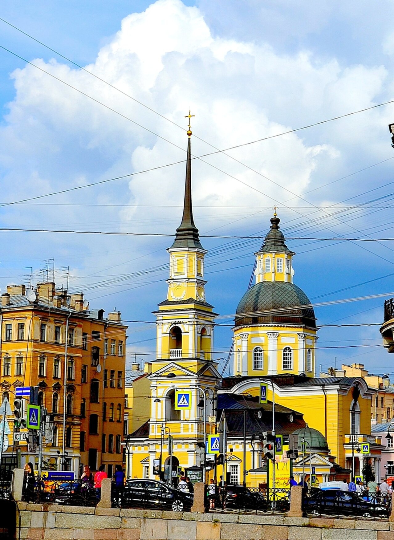На фотографии запечатлен величественный облик Церкви во имя святых и праведных Симеона Богоприимца и Анны Пророчицы, расположенной в историческом центре Санкт-Петербурга на пересечении улицы Белинского и Моховой улицы. Этот православный храм, освященный в честь благочестивых старцев, встретивших Господа Иисуса Христа в Иерусалимском храме, является одним из древнейших церковных сооружений города.