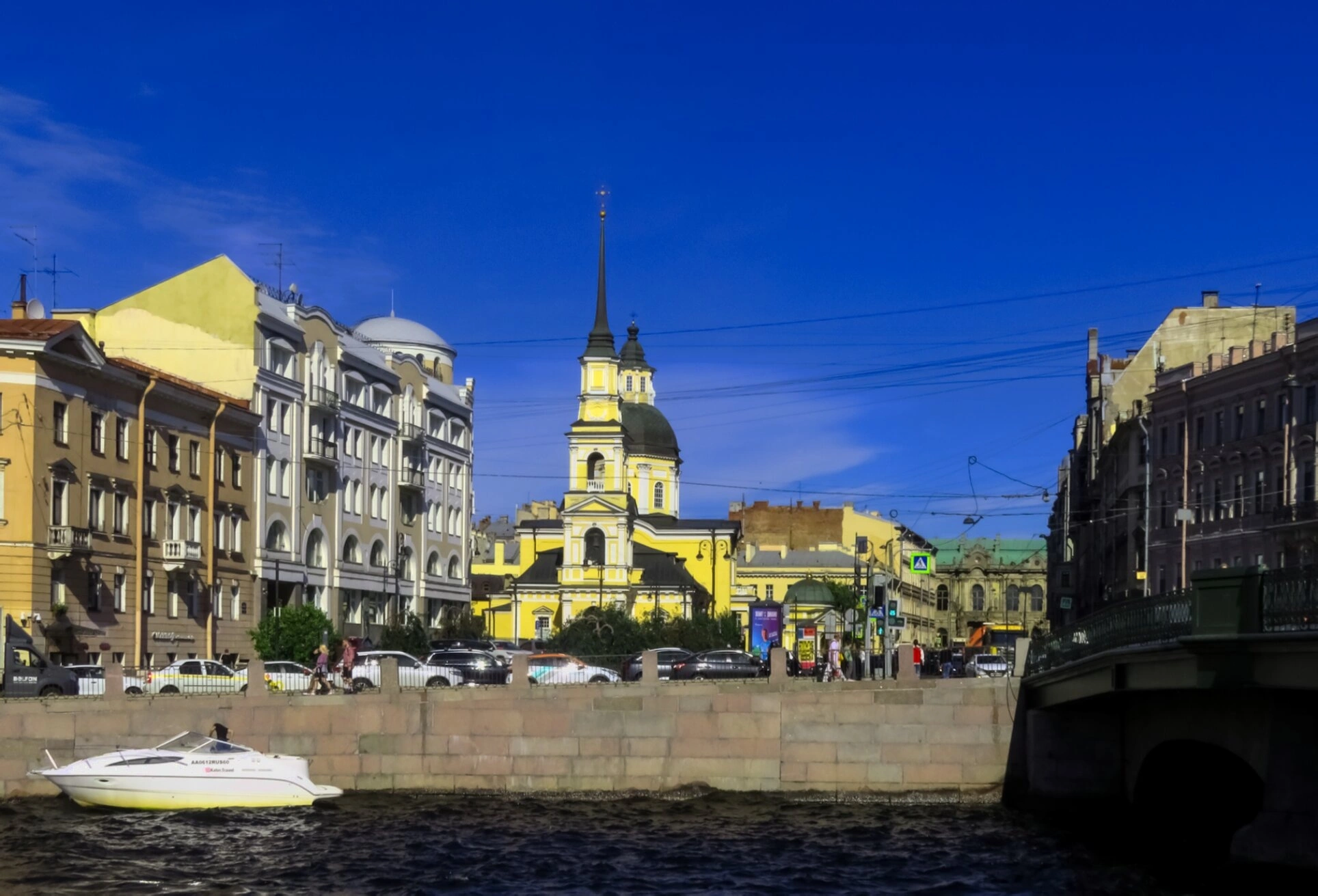 На снимке хорошо просматривается архитектурный облик храма, характерный для петровского барокко. Фасад церкви выполнен в жёлтых тонах с белыми декоративными элементами, что создаёт торжественный и нарядный вид. Центральный объём храма увенчан высоким шпилем с крестом, который гармонично сочетается с колокольней. Апсида храма обращена к реке Фонтанке, создавая живописный архитектурный ансамбль.
