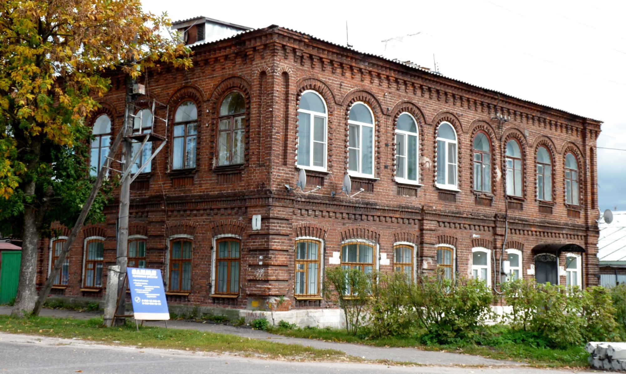 На фотографии запечатлено историческое здание церкви в честь святых мучеников Гурия, Самона и Авива, расположенное в древнем граде Муроме. Двухэтажное кирпичное строение представляет собой образец храмовой архитектуры XIX столетия. Фасад здания выполнен из красного кирпича, второй ярус украшен изящным рядом арочных окон, тогда как на первом этаже расположены оконные проемы прямоугольной формы.
