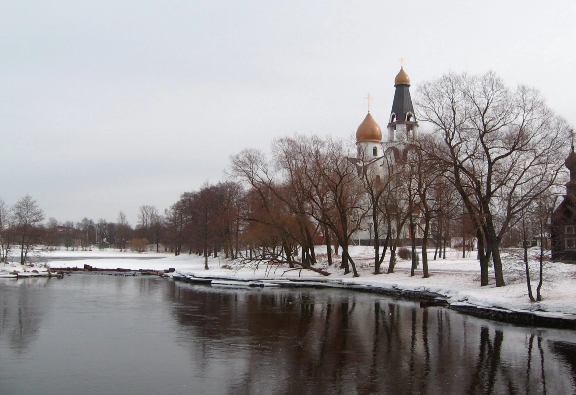 На представленной фотографии запечатлен зимний вид храма во имя Святых Первоверховных Апостолов Петра и Павла, расположенного в городе Сестрорецке. Святыня возвышается на берегу водной глади, создавая благодатный образ православной духовности в единении с северной природой.