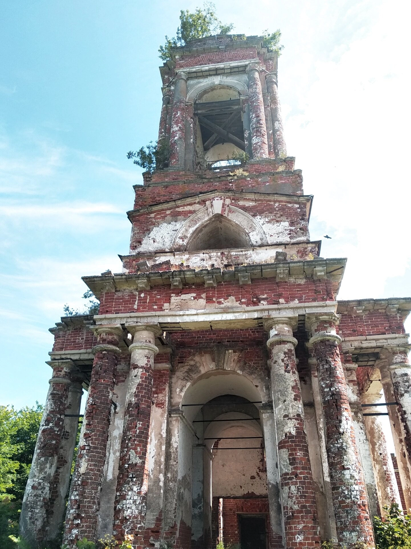 На представленной фотографии запечатлена церковь во имя святых праведных Богоотец Иоакима и Анны, расположенная в селе Алексино Владимирской области. Храм находится в полуразрушенном состоянии, что свидетельствует о сложной истории православной святыни в годы гонений на Церковь.