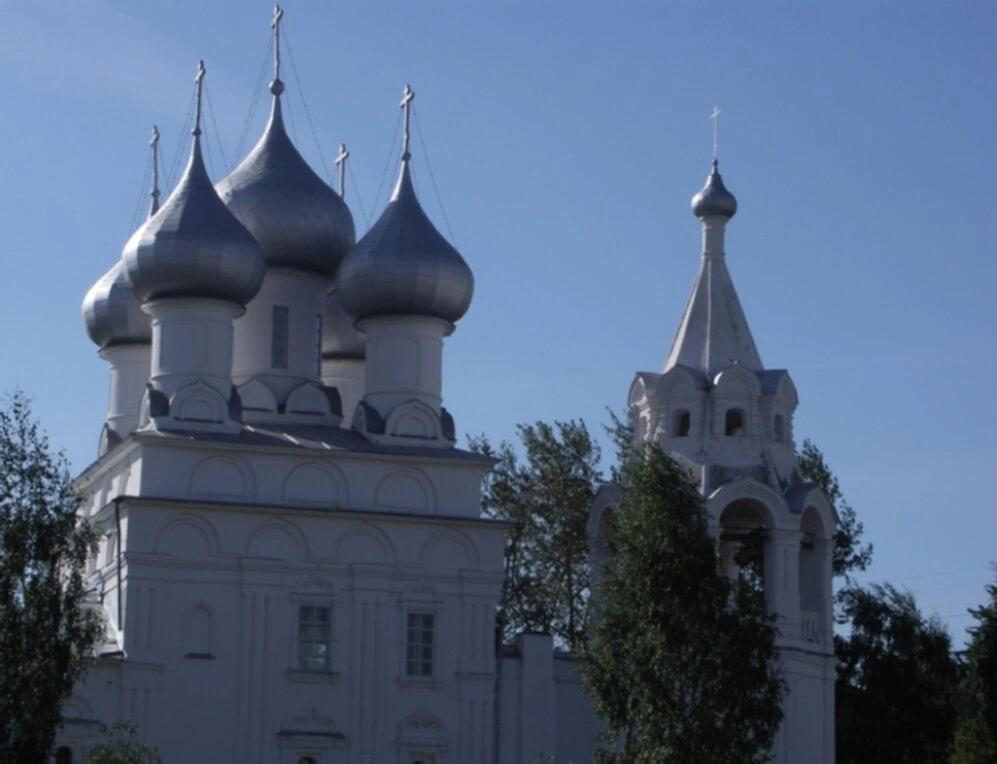 На представленной фотографии запечатлён храм во имя святых равноапостольных царя Константина и матери его царицы Елены, что находится в древнем граде Вологде. Этот старинный каменный пятиглавый храм с высокой шатровой колокольней является одним из выдающихся памятников церковной архитектуры XVII века и объектом культурного наследия.