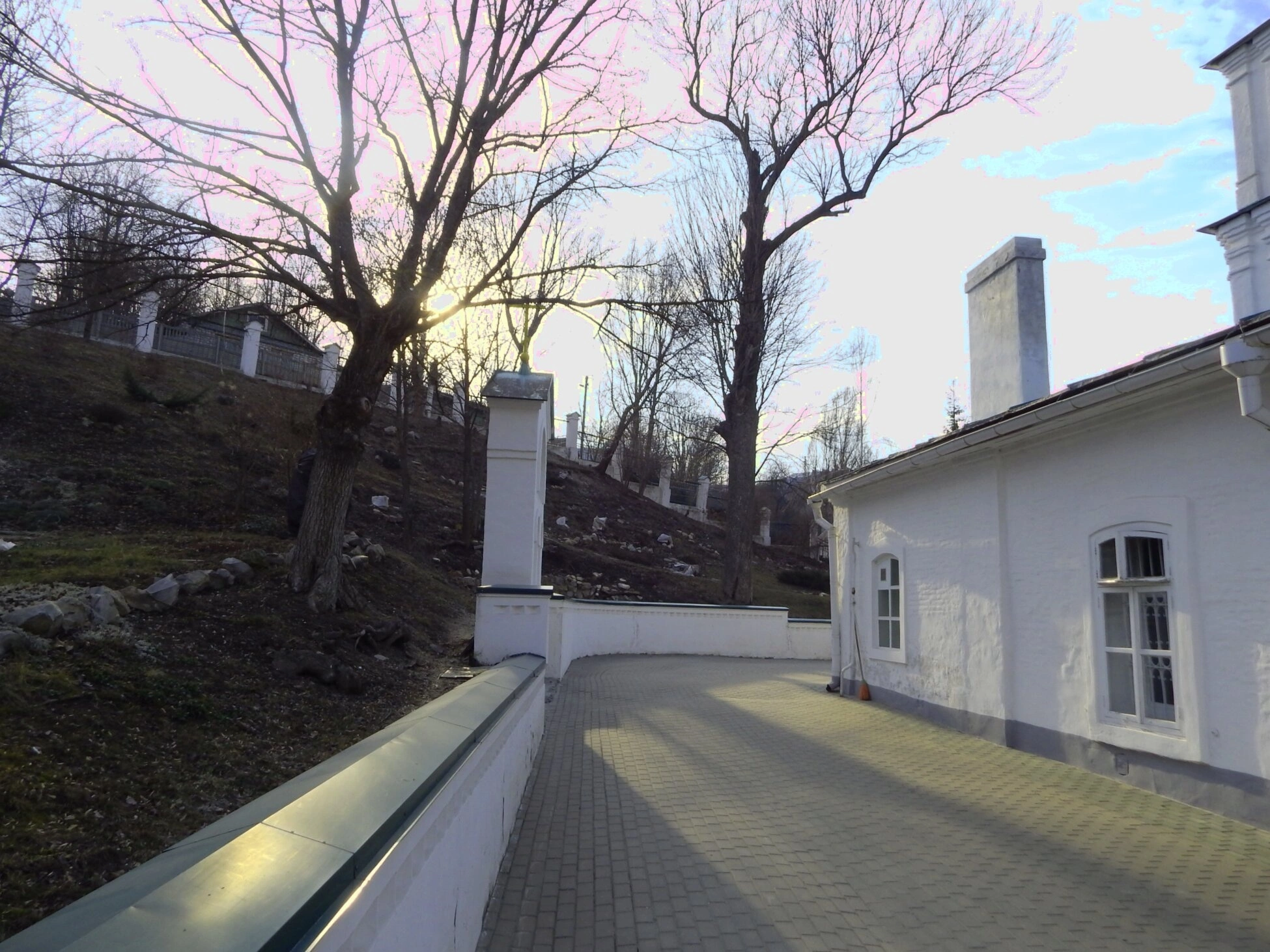 На снимке чётко видны архитектурные формы святого места: строгие линии белых стен, арочные оконные проёмы и традиционный для православного зодчества дымоход, гармонично вписанный в общий ансамбль. Рядом с храмом пролегает мощёная камнем дорожка, ведущая вдоль невысокого парапета, что создаёт ощущение уединённости и покоя, свойственного монастырской жизни.