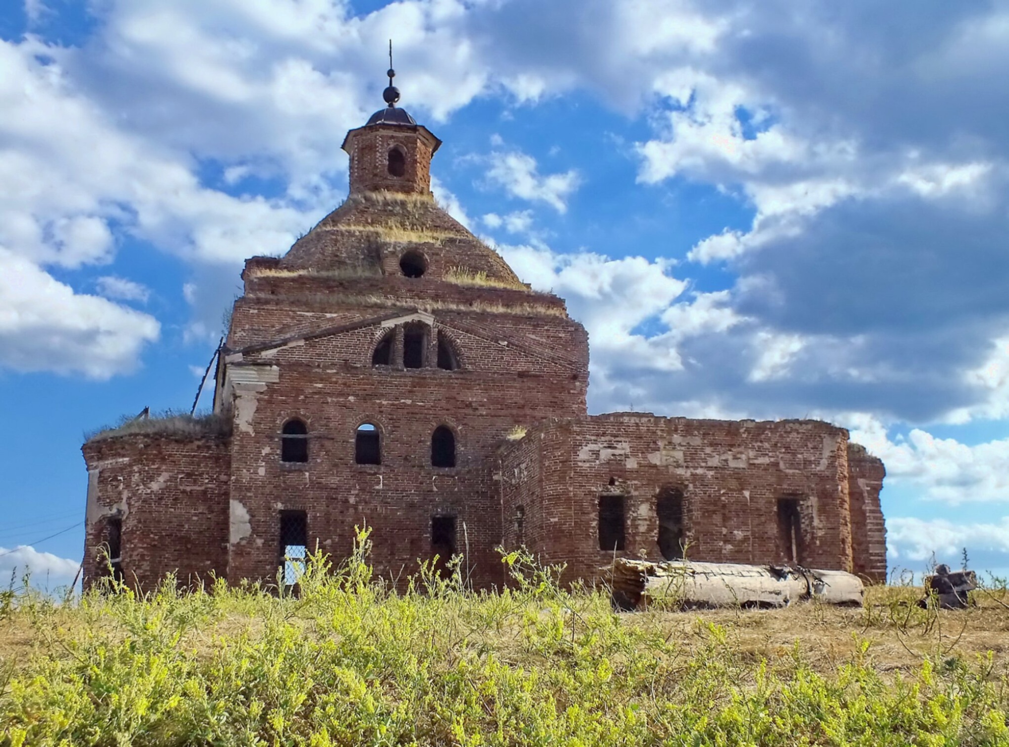 Здание церкви выстроено из красного кирпича и обладает традиционной для православных храмов объёмно-пространственной композицией. Несмотря на сильные повреждения, в облике сооружения угадываются первоначальные формы: основной объём, апсида и колокольня, увенчанная куполом с сохранившимся крестом. Нарушения кровли и утрата части кладки свидетельствуют о длительном запустении святого места.