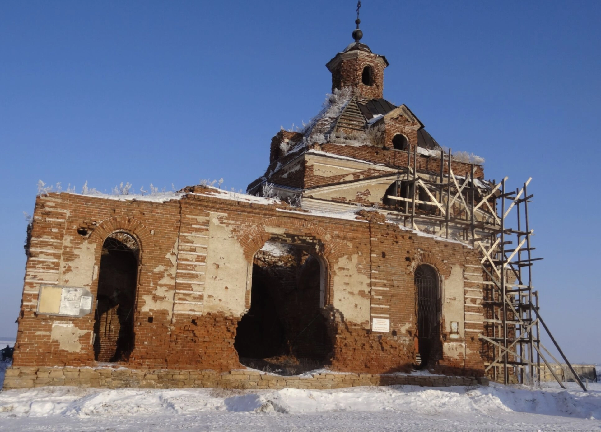 На фотографии запечатлена полуразрушенная церковь в честь Тихвинской иконы Божией Матери, расположенная в селе Рыбниковское Свердловской области. Храм, ныне пребывающий в запустении, представляет собой скорбное зрелище, напоминая о былой духовной жизни этих мест. Снятое в зимний период, изображение передаёт суровость окружающего пейзажа: кирпичные стены, утратившие свою штукатурку, контрастируют с чистым снегом и ясным голубым небом.