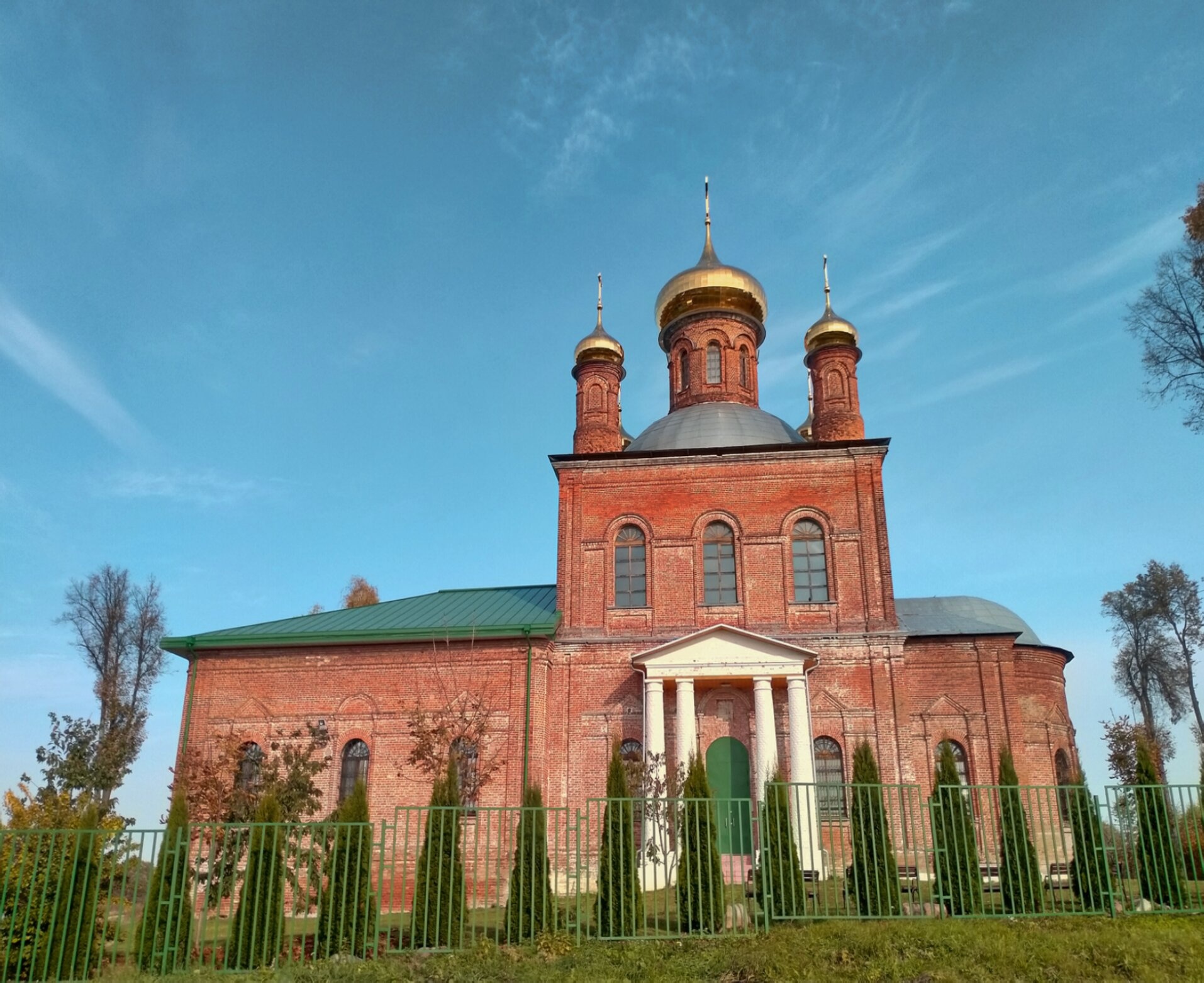 Фотография сделана в ясный солнечный день, что позволяет рассмотреть все архитектурные детали храма. Естественное освещение подчеркивает богатство цветовой палитры сооружения и отбрасывает четкие тени, выделяя объемно-пространственную композицию здания. Храм предстает в своем великолепии как духовный центр и архитектурная доминанта села.