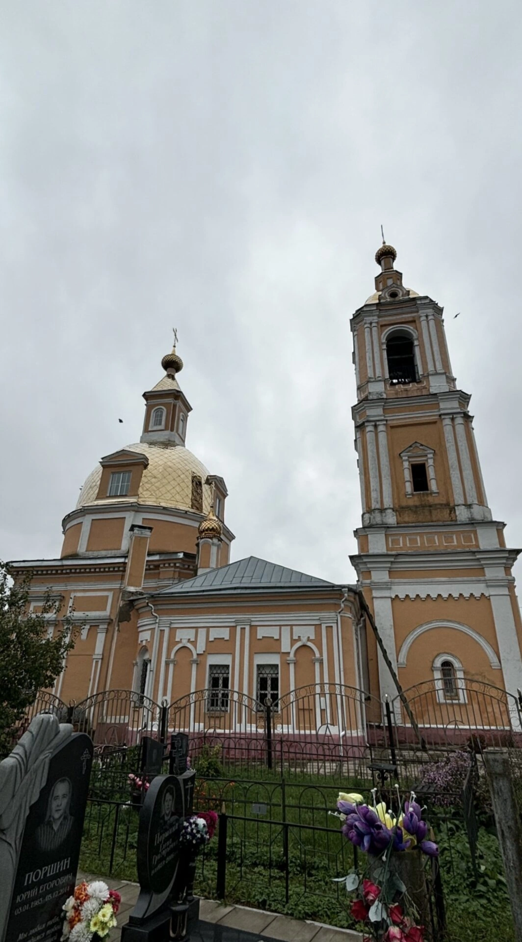 Территория вокруг церкви обнесена ажурной металлической оградой, что является характерной особенностью храмового зодчества. На переднем плане фотографии виднеются надгробные памятники, свидетельствующие о наличии церковного кладбища — традиционного места упокоения православных христиан. На одном из надгробий четко читается фамилия «Поршин», что указывает на историческую преемственность и память о предках.
