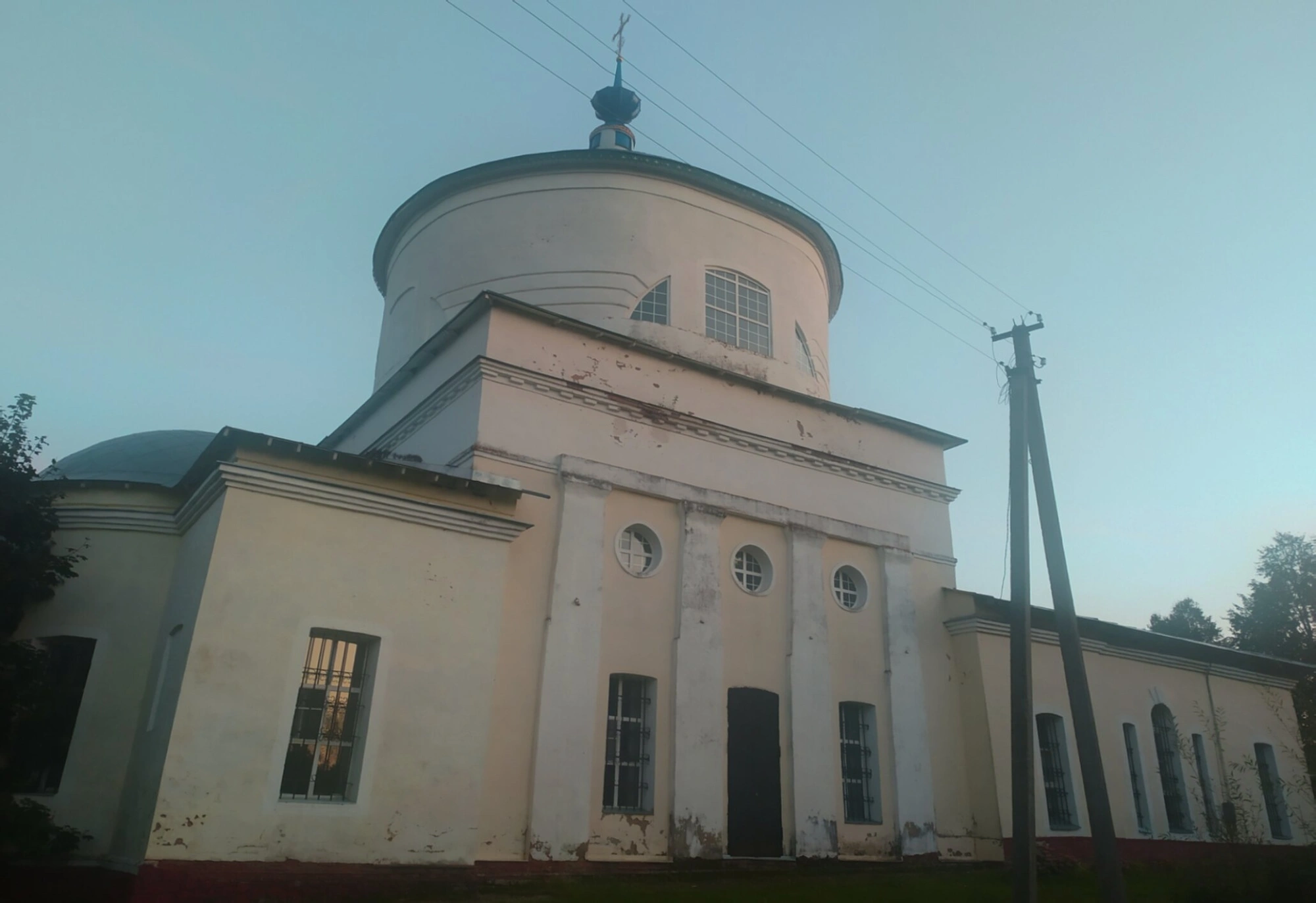 Фасад церкви украшают несколько прямоугольных окон, характерных для традиционной русской храмовой архитектуры. Водосточная система, выполненная в синих тонах, гармонично сочетается с цветом кровли, создавая целостный архитектурный ансамбль.
