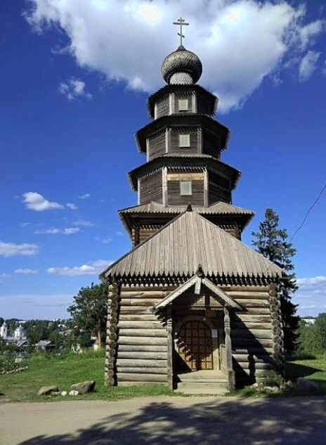 На фотографии запечатлена Церковь Тихвинской иконы Божией Матери, расположенная в древнем городе Торжке Тверской области. Этот храм является выдающимся образцом русского деревянного зодчества, сохранившим традиционные формы и благолепие православной архитектуры.