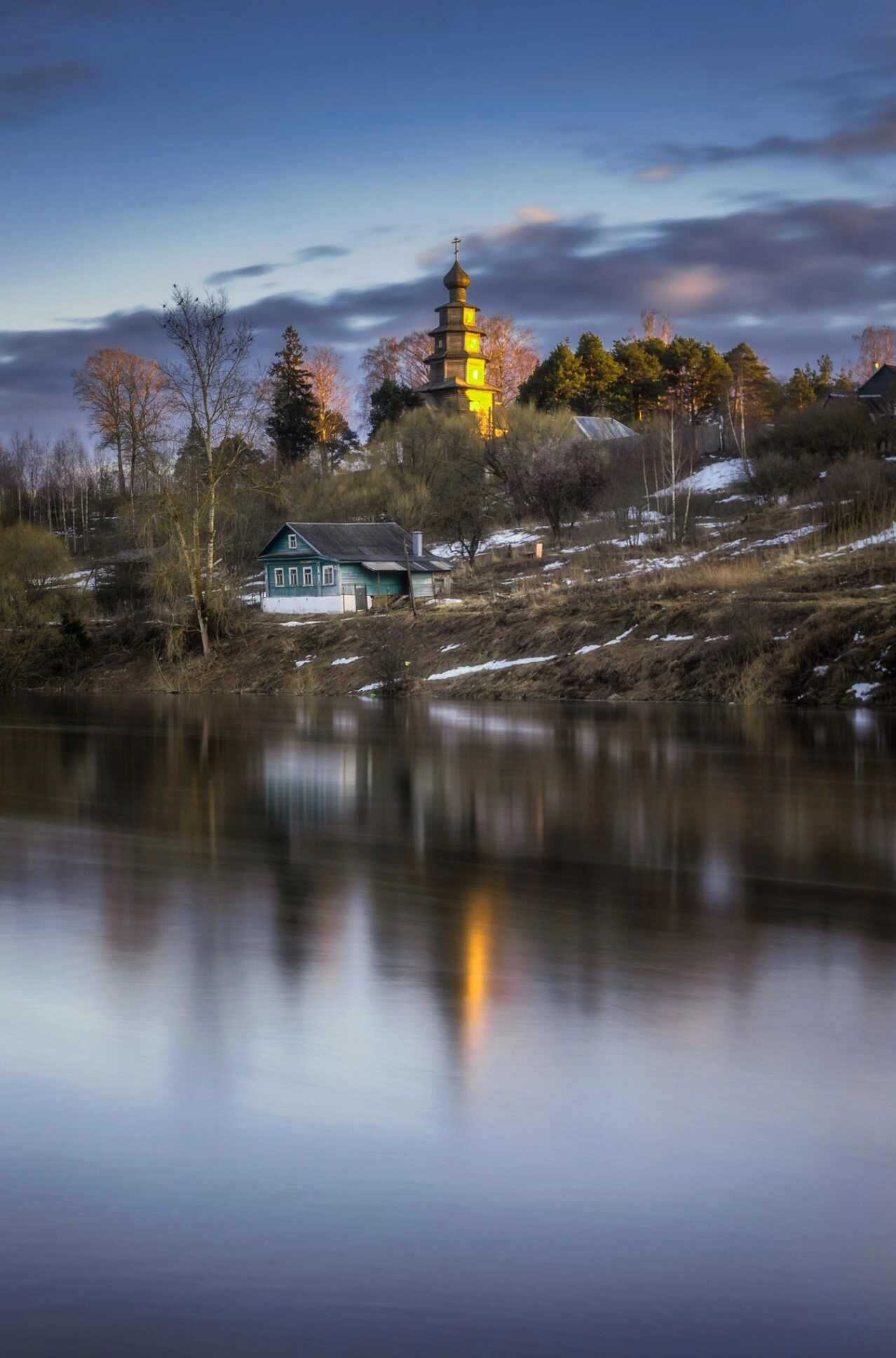 Деревянная церковь с многоярусным шатровым завершением увенчана стройным куполом с воздвигнутым крестом, символизирующим победу жизни над смертью. Стены храма, окрашенные в тёплый жёлтый цвет, мягко освещены лучами заходящего солнца, что создаёт ощущение благодати и духовного тепла.