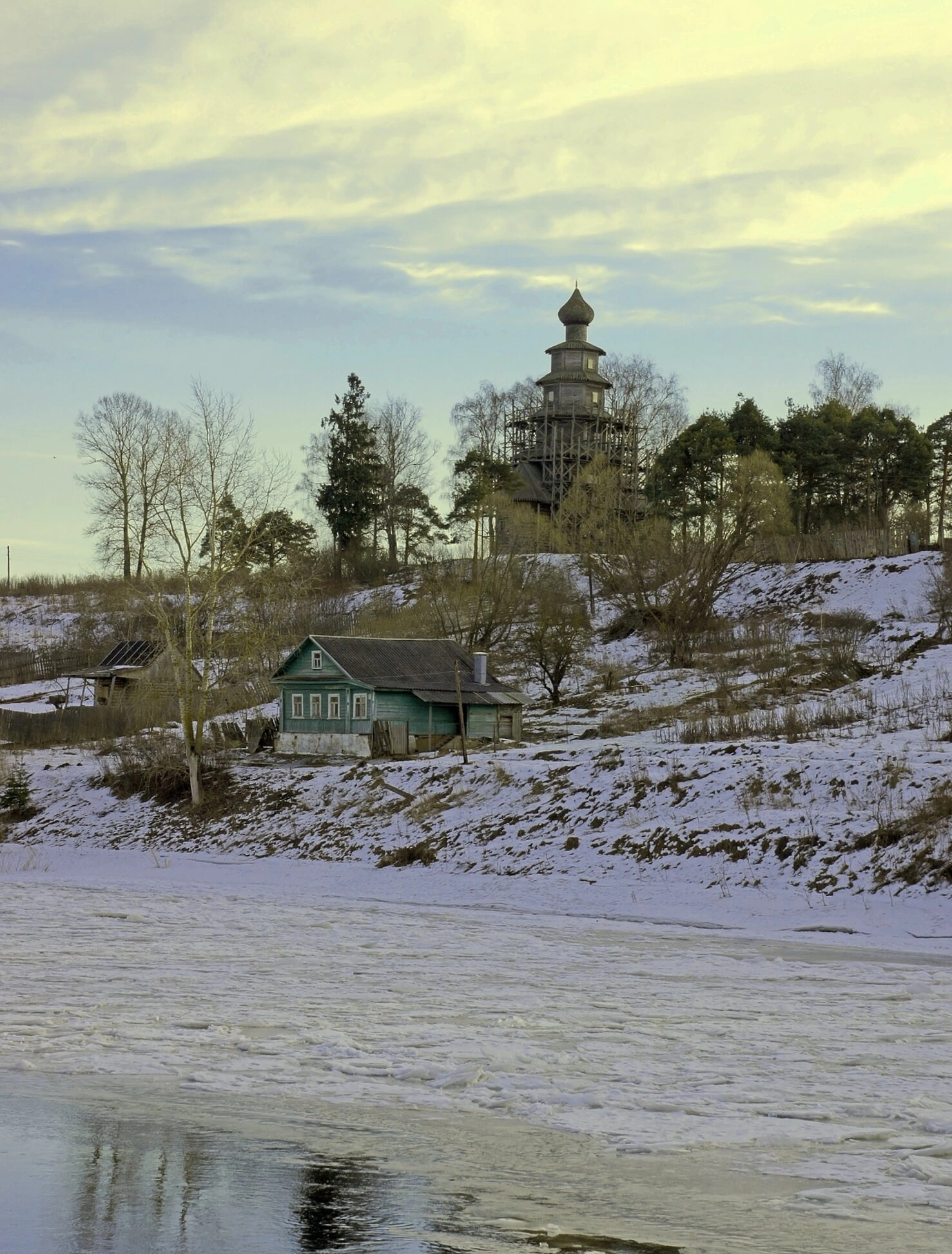 На представленной фотографии запечатлена деревянная Церковь Тихвинской иконы Божией Матери, расположенная в древнем городе Торжке Тверской области. Храм возвышается на заснеженном холме на левом берегу реки Тверцы, что соответствует историческому местоположению данного святилища. Это один из немногих сохранившихся образцов деревянного клетского зодчества Верхневолжья, освящённый в честь чтимой православной святыни — Тихвинского образа Пресвятой Богородицы.
