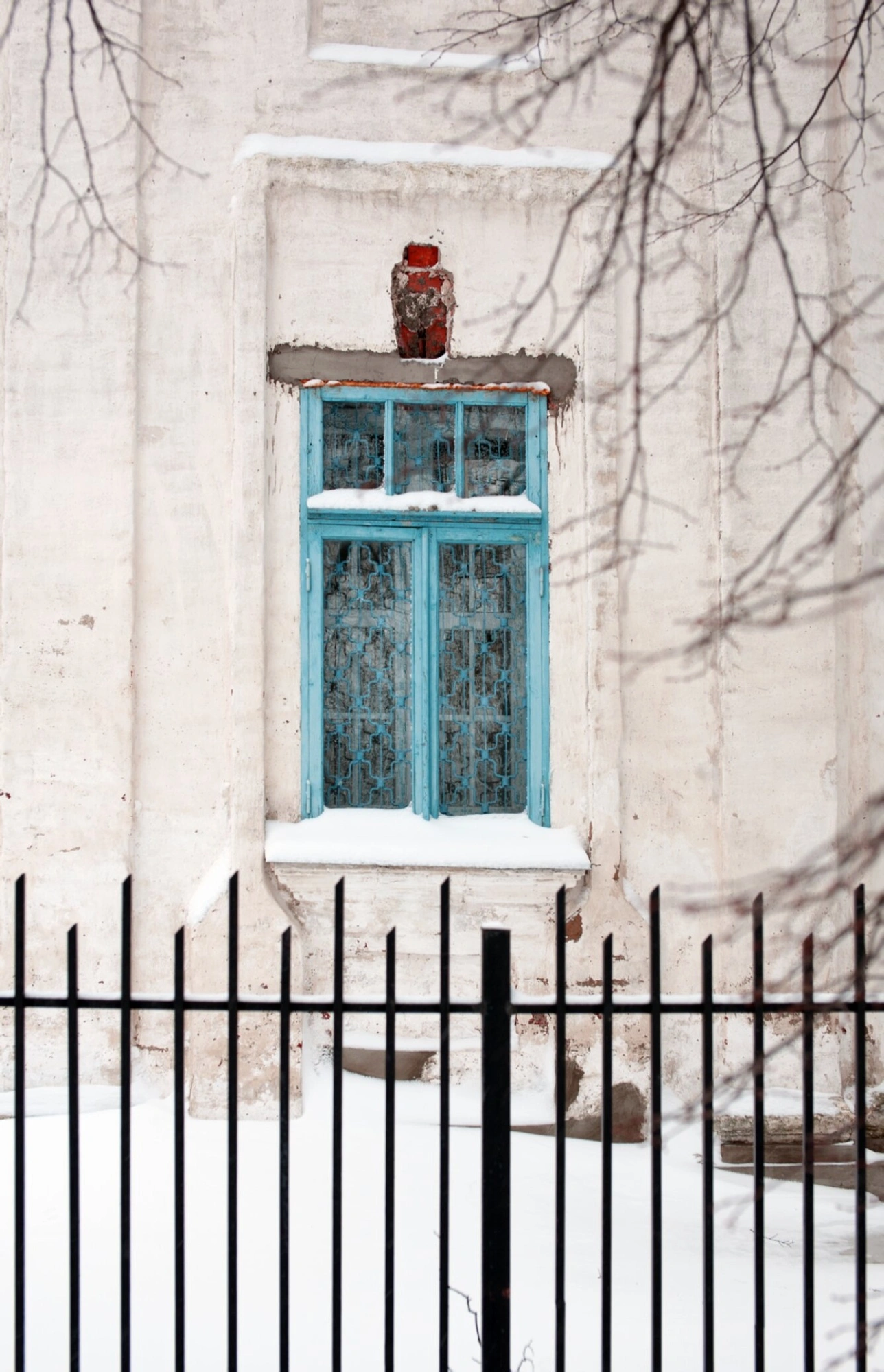 В центре кадра привлекает внимание старинное окно с голубыми рамами, частично припорошенное снегом. Над оконным проёмом взгляд останавливается на декоративном элементе, характерном для русского церковного зодчества. Чёрная металлическая ограда в нижней части кадра и голые ветви деревьев, отбрасывающие тени на белую стену, дополняют картину морозного дня.