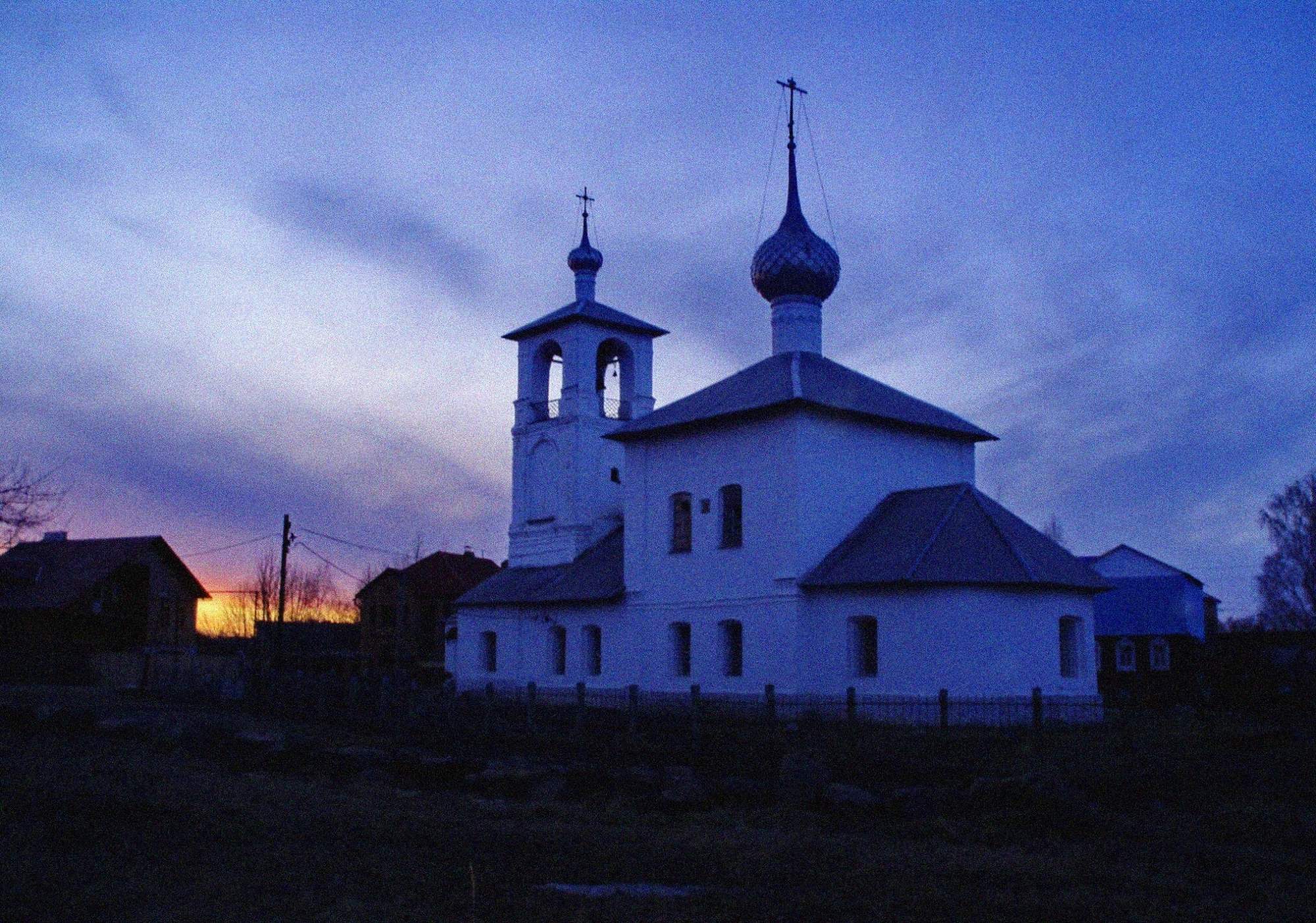 На представленной фотографии запечатлена Церковь Толгской иконы Божией Матери, что располагается в древнем граде Ростове Великом. Снимок выполнен в час сумерек или на заре, когда мягкое неяркое освещение озаряет белокаменные стены храма, придавая всему образу величие и благоговейную тишину. Золотой крест, венчающий главный купол, устремляется в небесную высь, символизируя молитвенную связь земли и неба.
