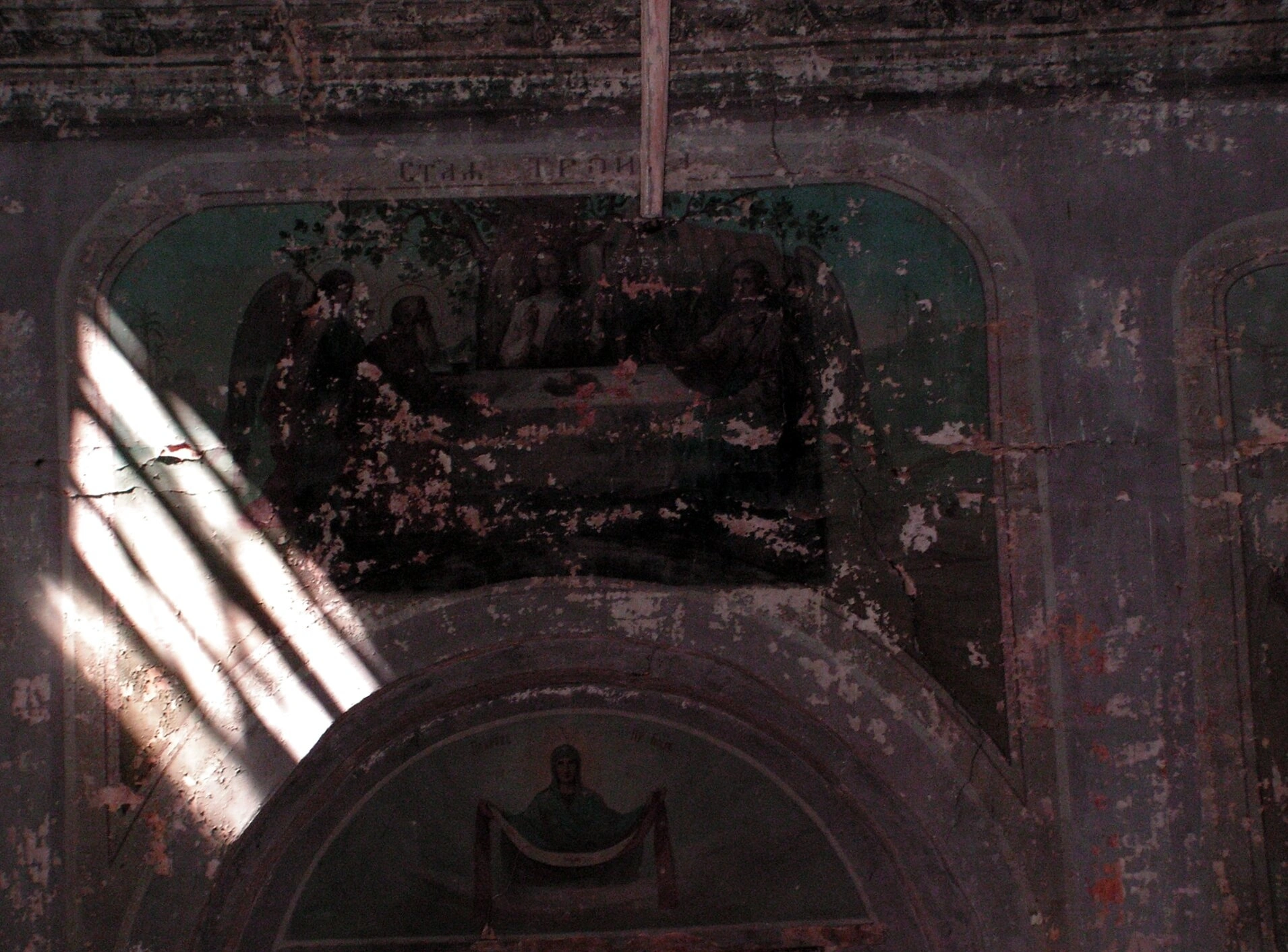 Луч света, проникающий сквозь оконный проем, озаряет старинную роспись, подчеркивая ее величие даже в состоянии разрушения. Этот свет становится метафорой божественного откровения, которое продолжает жить в стенах заброшенного храма. Ниже основной композиции, в арочном проеме, располагается еще один фрагмент живописи, что характерно для многослойного устройства храмовых росписей, когда более поздние образы наслаивались на ранние.
