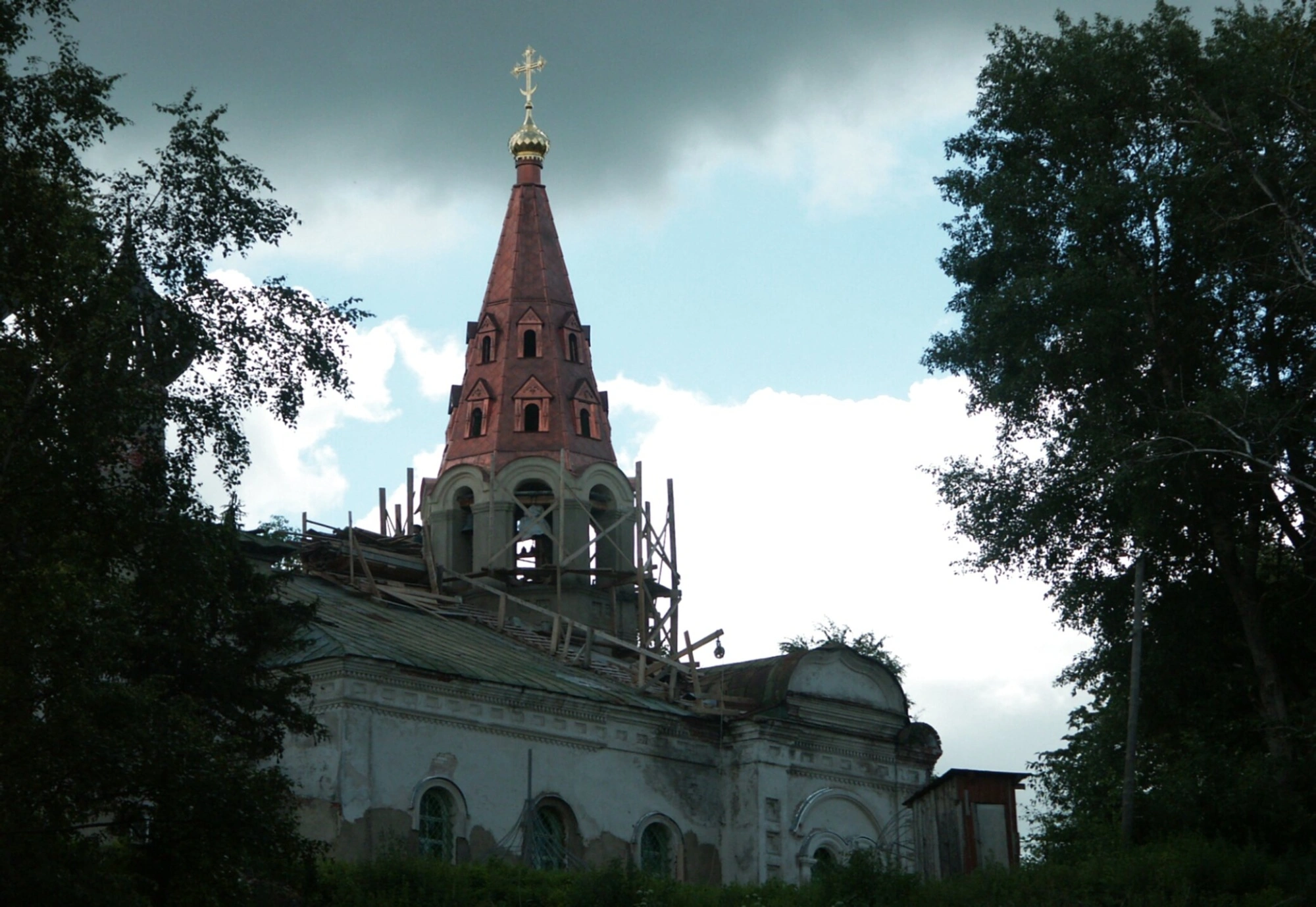На снимке хорошо просматривается монументальная колокольня с шатровым завершением, увенчанная золоченым крестом, который символизирует победу жизни над смертью. Вокруг колокольни и основной части храма установлены деревянные строительные леса, свидетельствующие о проведении реставрационных работ по сохранению этого духовного наследия.