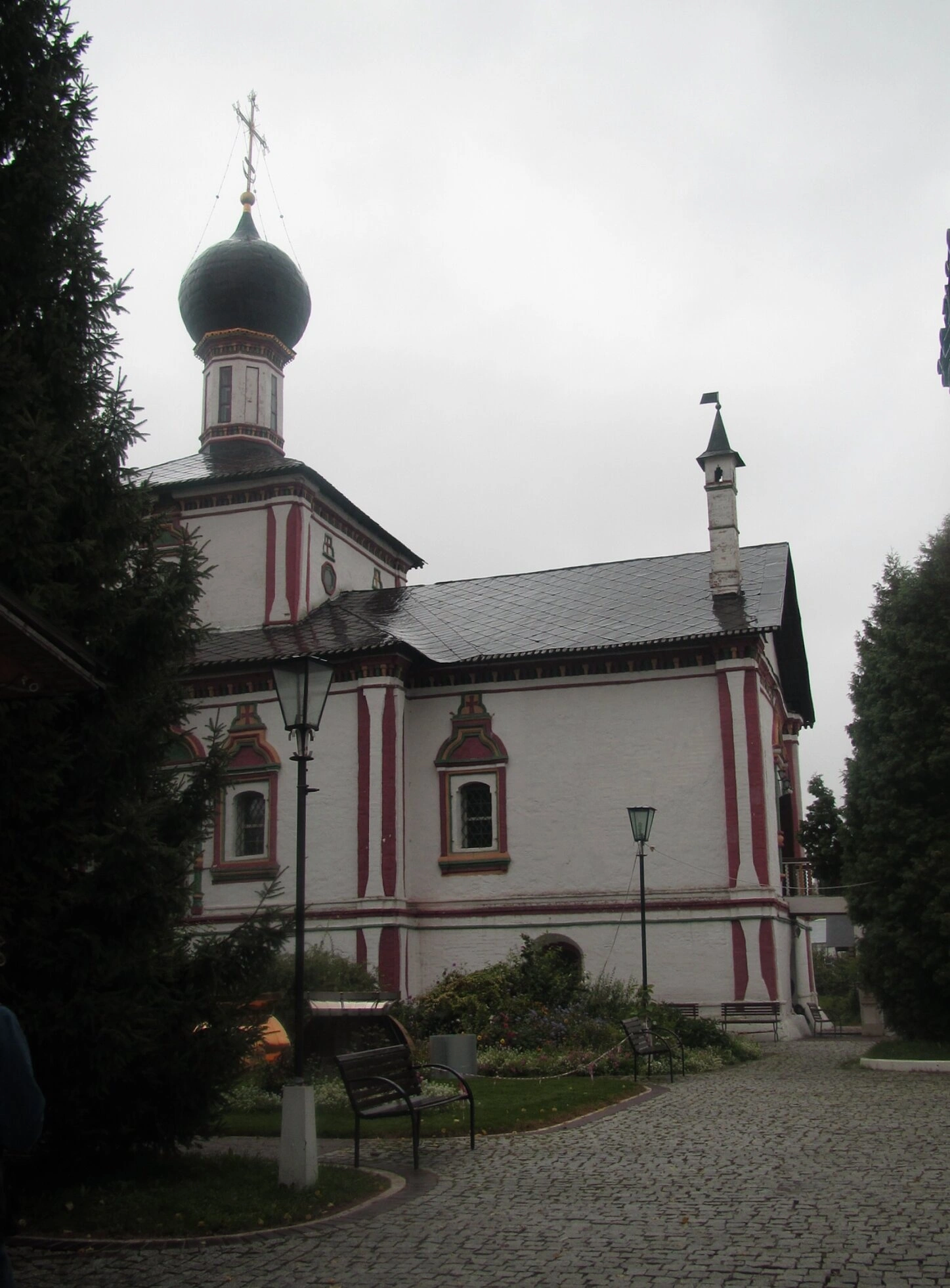 Фотография сделана в пасмурный день, когда мягкий рассеянный свет подчеркивает благородство цветовой гаммы храма и создает особую сдержанную атмосферу, располагающую к созерцанию и молитве. На снимке отсутствуют люди, что позволяет в полной мере оценить архитектурное совершенство этой православной святыни.