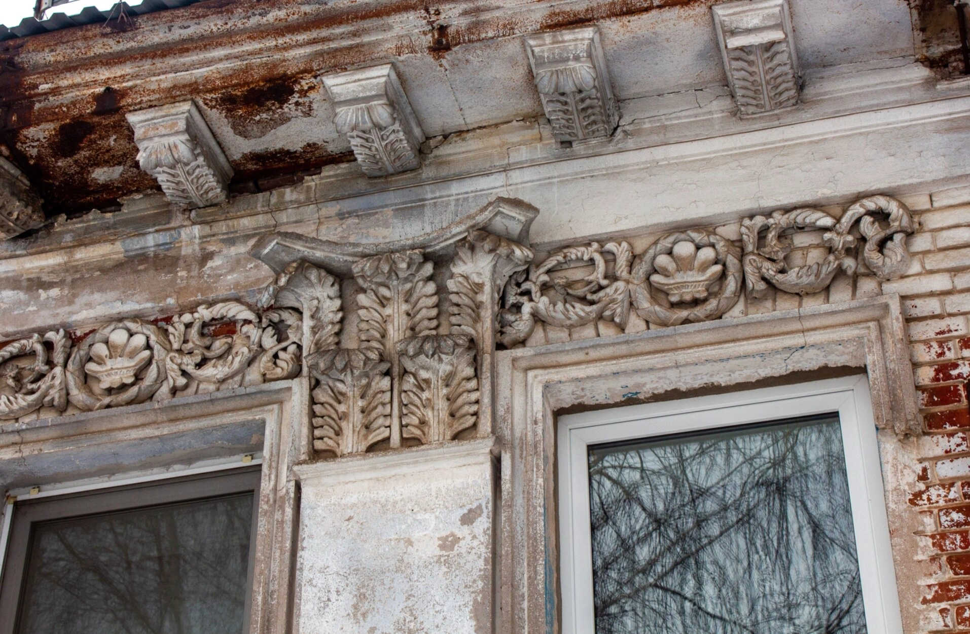 К сожалению, фотография фиксирует неудовлетворительное состояние памятника. Наблюдается значительное разрушение лепного декора, штукатурный слой местами утрачен, обнажая кирпичную кладку. На элементах карниза видны следы коррозии и естественного разрушения, требующие проведения срочных консервационных работ.