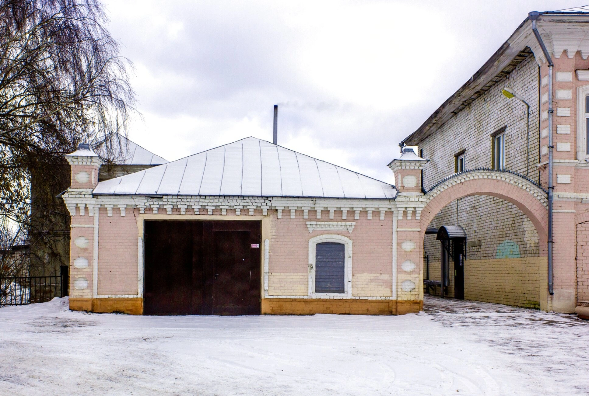 При детальном рассмотрении отмечается ветхость сооружения: местами облупилась штукатурка, обнажив кирпичную кладку, видны трещины, требующие незамедлительного вмешательства. Контрастным элементом являются современные пластиковые оконные рамы, установленные в исторические оконные проёмы.