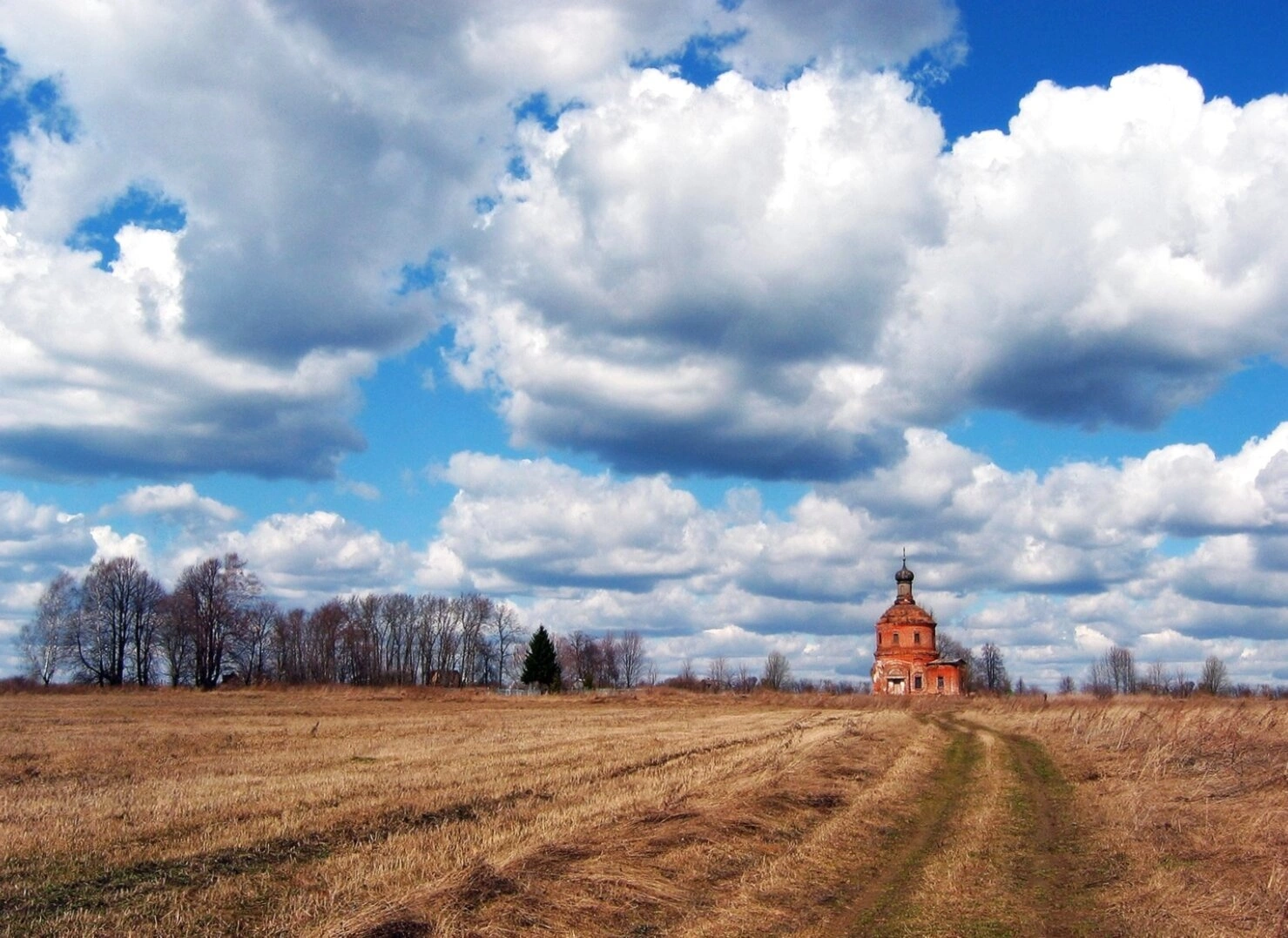Церковь окружена полем, покрытым сухой травой, что указывает на съемку в осенний или ранневесенний период. К храму ведет накатанная грунтовая дорога, проходящая через открытое пространство. На горизонте виднеются голые деревья и кустарники, создающие естественное обрамление для архитектурного памятника.