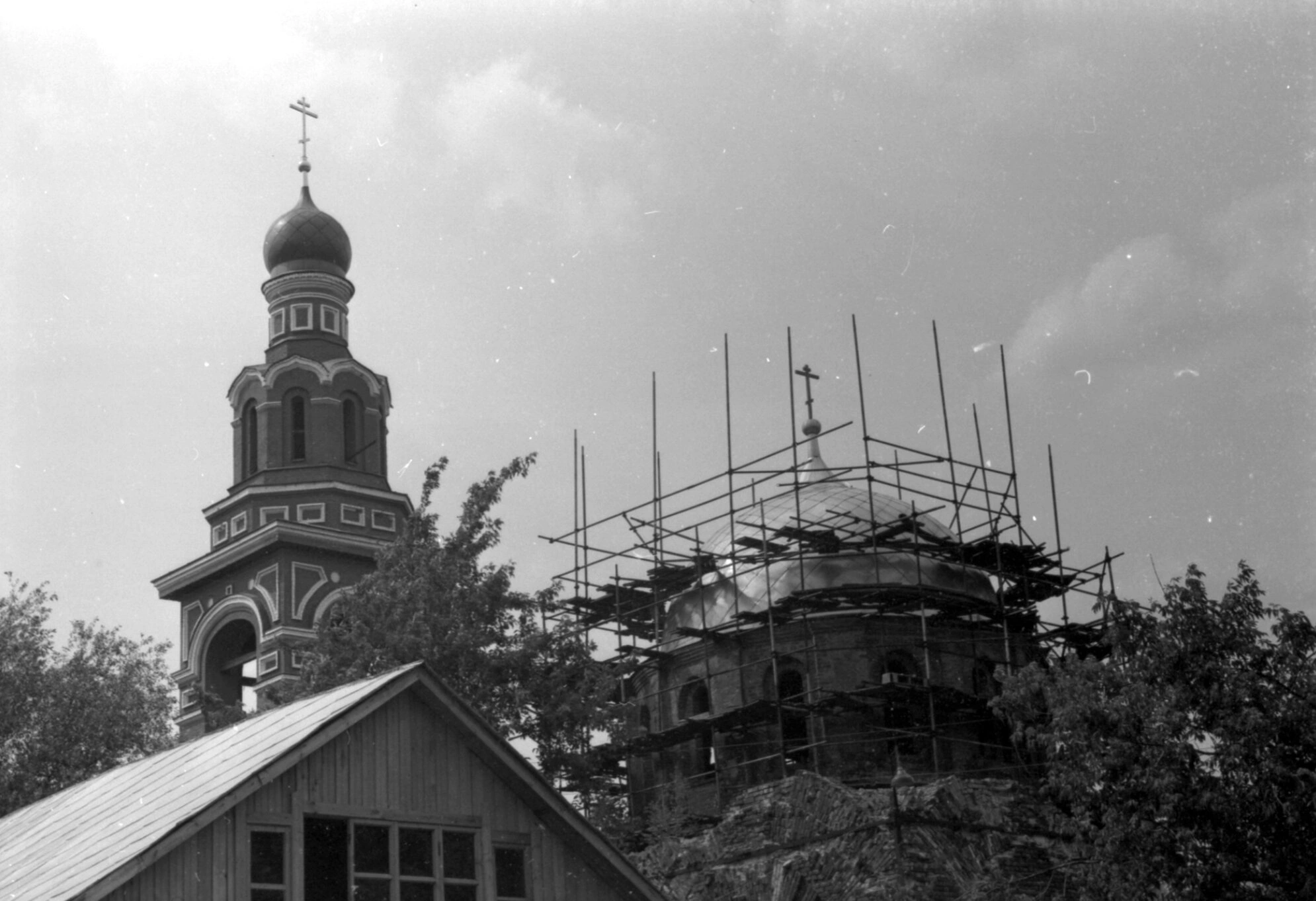 Исторический контекст свидетельствует, что храм был закрыт в 1937 году и пребывал в запустении до 1989 года, когда его возвратили верующим в аварийном состоянии. Фотография документально фиксирует важный этап в истории возрождения этой православной святыни.