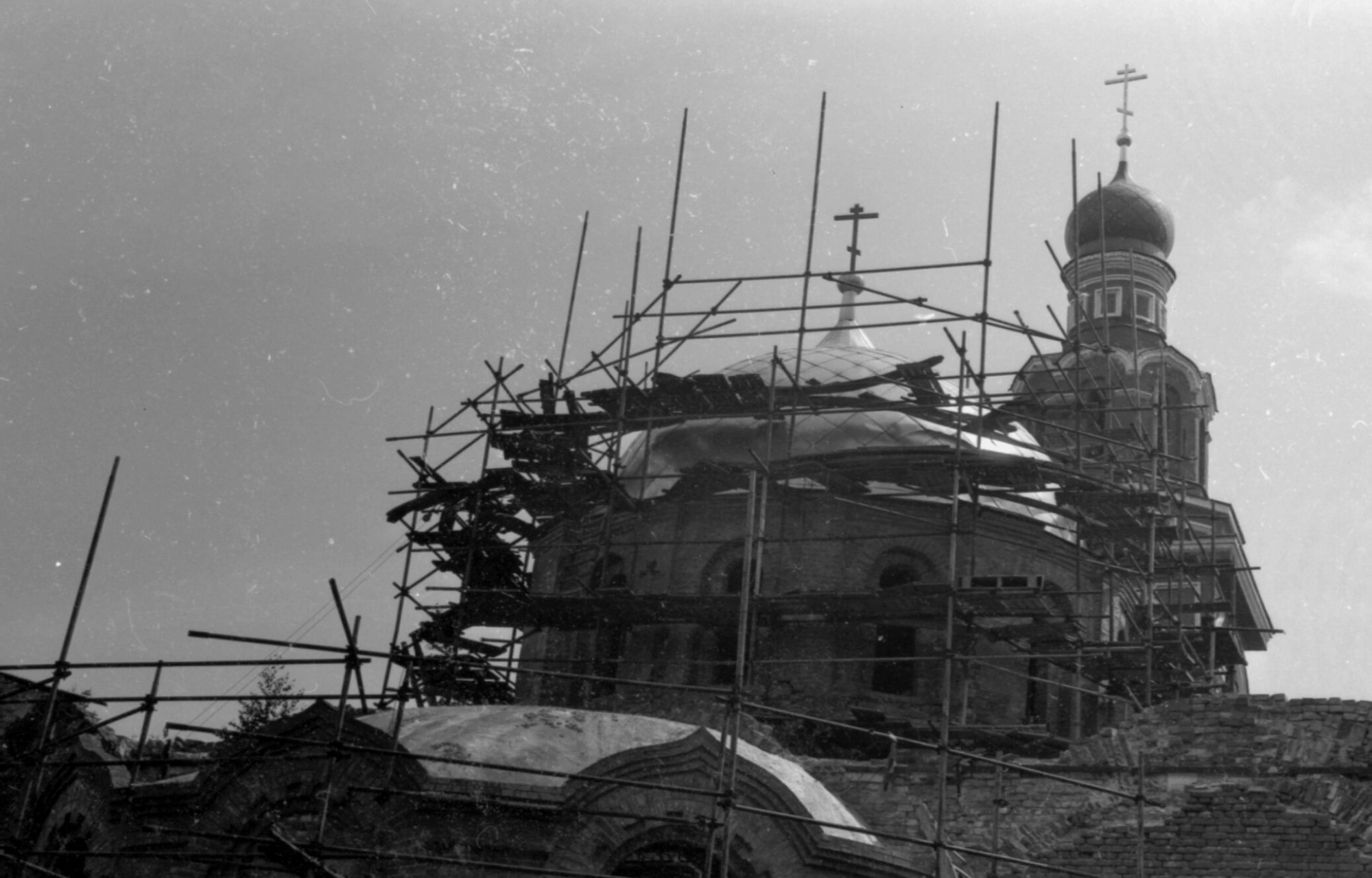 На представленной фотографии запечатлён исторический момент восстановления Церкви Троицы Живоначальной в городе Электроугли Московской области. Снимок сделан в 1994 году, когда храм, переживший годы забвения и разрушения, начал возрождаться для возвращения к своей духовной миссии.