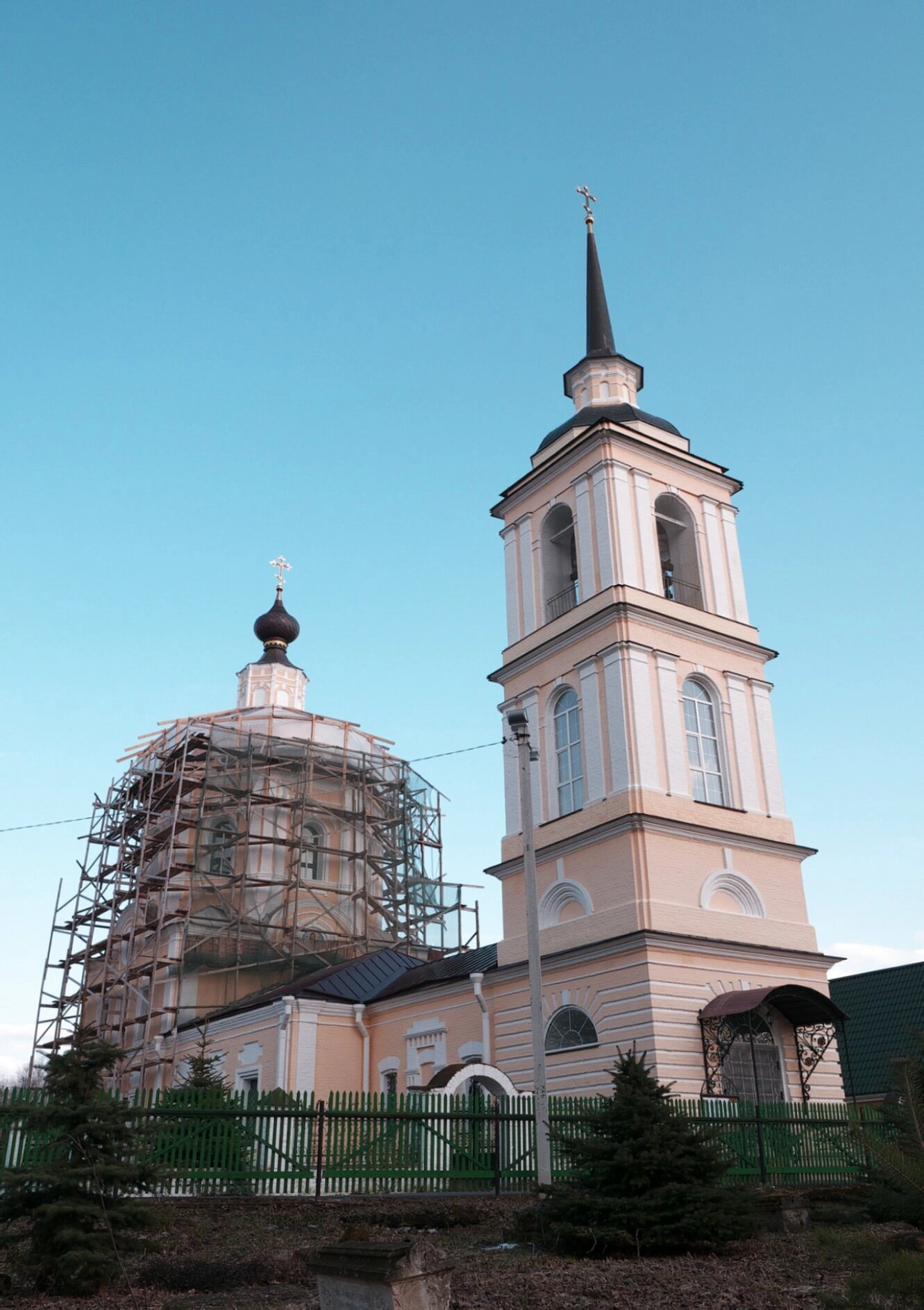 На снимке хорошо видно основное здание храма, часть которого покрыта строительными лесами, что свидетельствует о проведении реставрационных работ. Это говорит о внимательном отношении к сохранению духовного наследия и поддержании благолепия дома Божия. Рядом возвышается стройная колокольня, окрашенная в светлые тона, которая составляет единый архитектурный ансамбль с церковью.