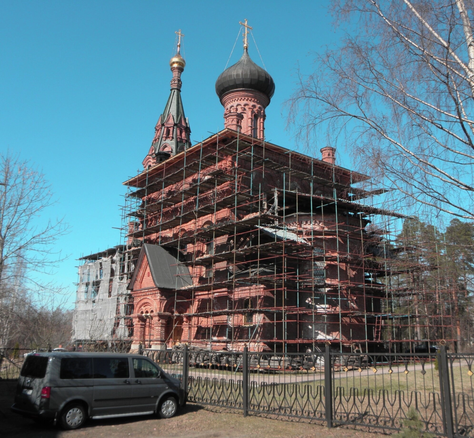 Здание храма, выполненное из красного кирпича, находится на активном этапе реставрации, о чём красноречиво свидетельствуют окружающие его строительные леса. Над основным объёмом возвышаются несколько глав: центральная золочёная маковка, сияющая в лучах солнца, и тёмные боковые купола, создающие гармоничный и величественный силуэт.