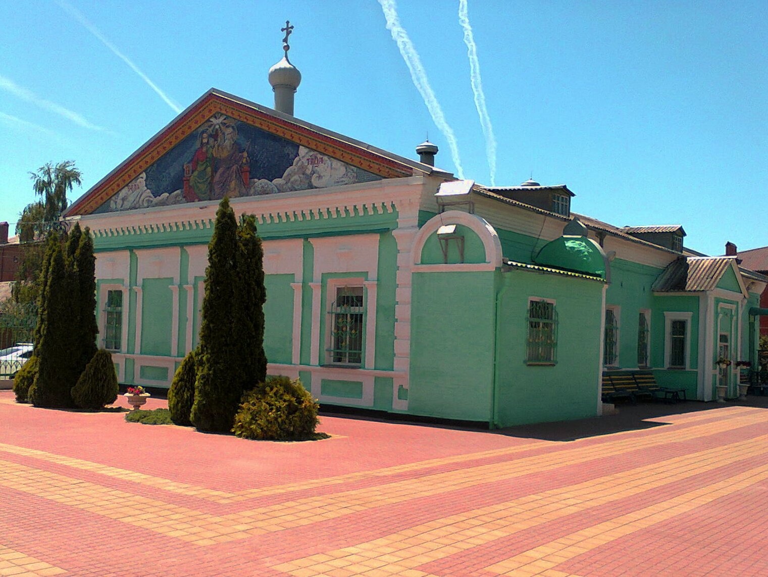 Перед входом в святыню расстилается благоустроенная мощёная площадь с геометрическим узором, приглашая паломников и прихожан переступить порог храма. Аккуратно подстриженные хвойные деревья и кустарники, обрамляющие площадь, добавляют месту благоговейной торжественности и уюта, создавая гармонию между творением рук человеческих и природной красотой.