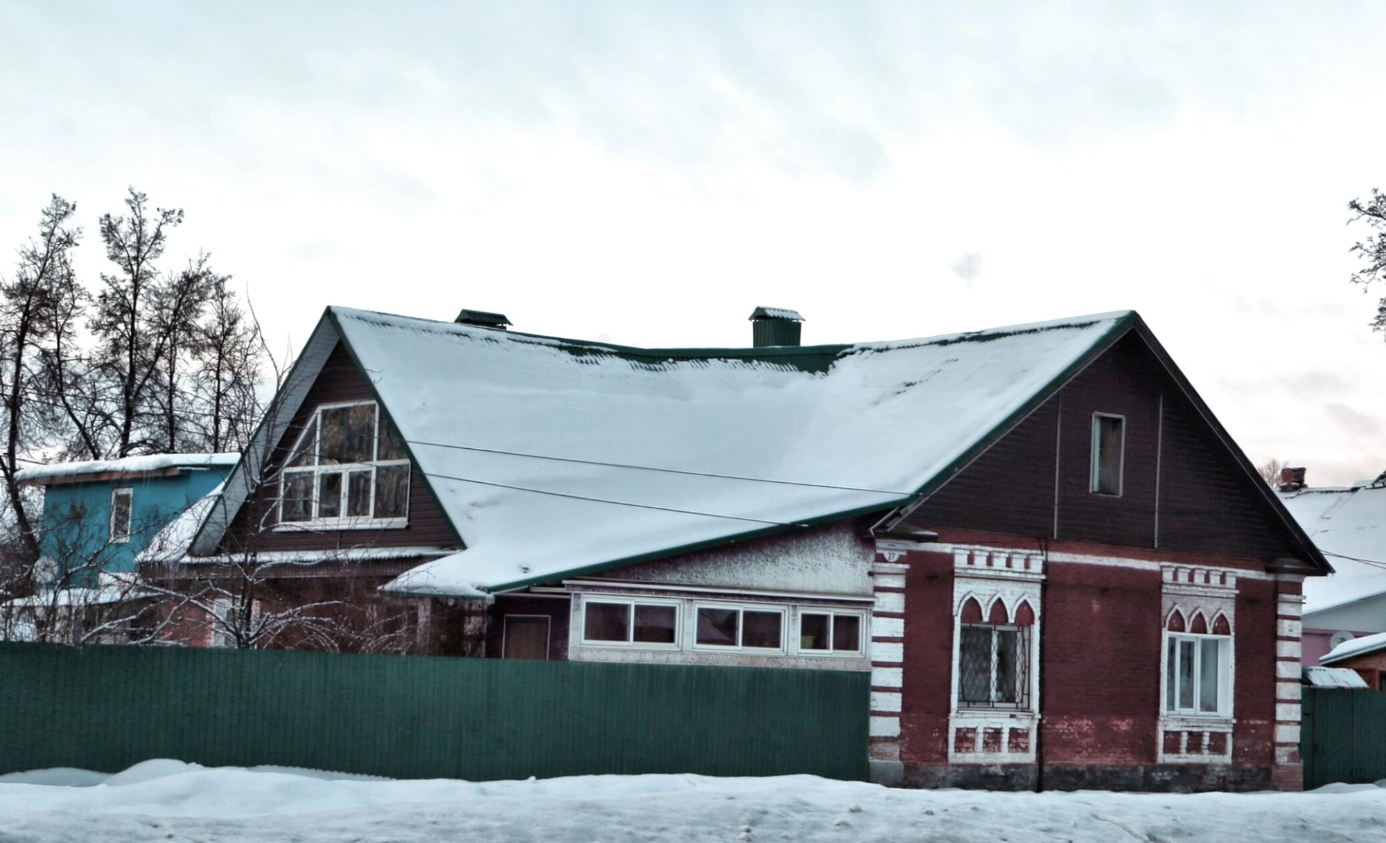 Высокий деревянный фронтон и двускатная кровля, покрытые сединой зимнего снега, создают возвышенный образ православной святыни. На переднем плане виднеется деревянное ограждение и снежные сугробы, что свидетельствует о зимнем времени съёмки.