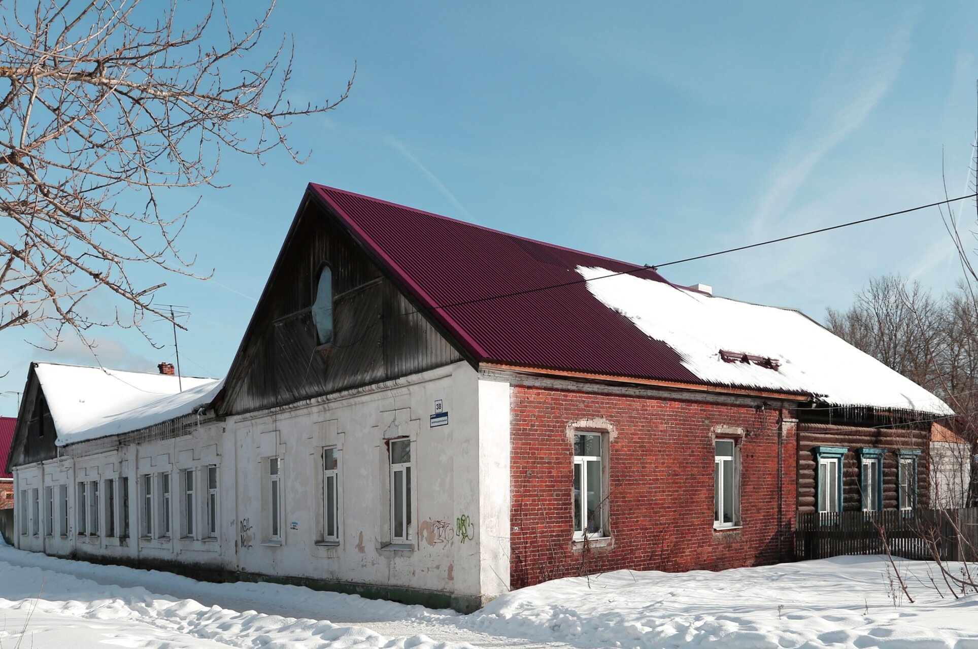 С левой стороны здания видна пристройка желтого цвета, а на крыше возвышается кирпичная дымовая труба. На углу храма закреплена синяя табличка с указанием адреса. Перед церковью установлен деревянный столб с проводами, несколько наклоненный в сторону здания. Зимний пейзаж подчеркивает величие и спокойствие этого православного сооружения, являющегося объектом культурного наследия и важным духовным центром для верующих города Гусь-Хрустальный.