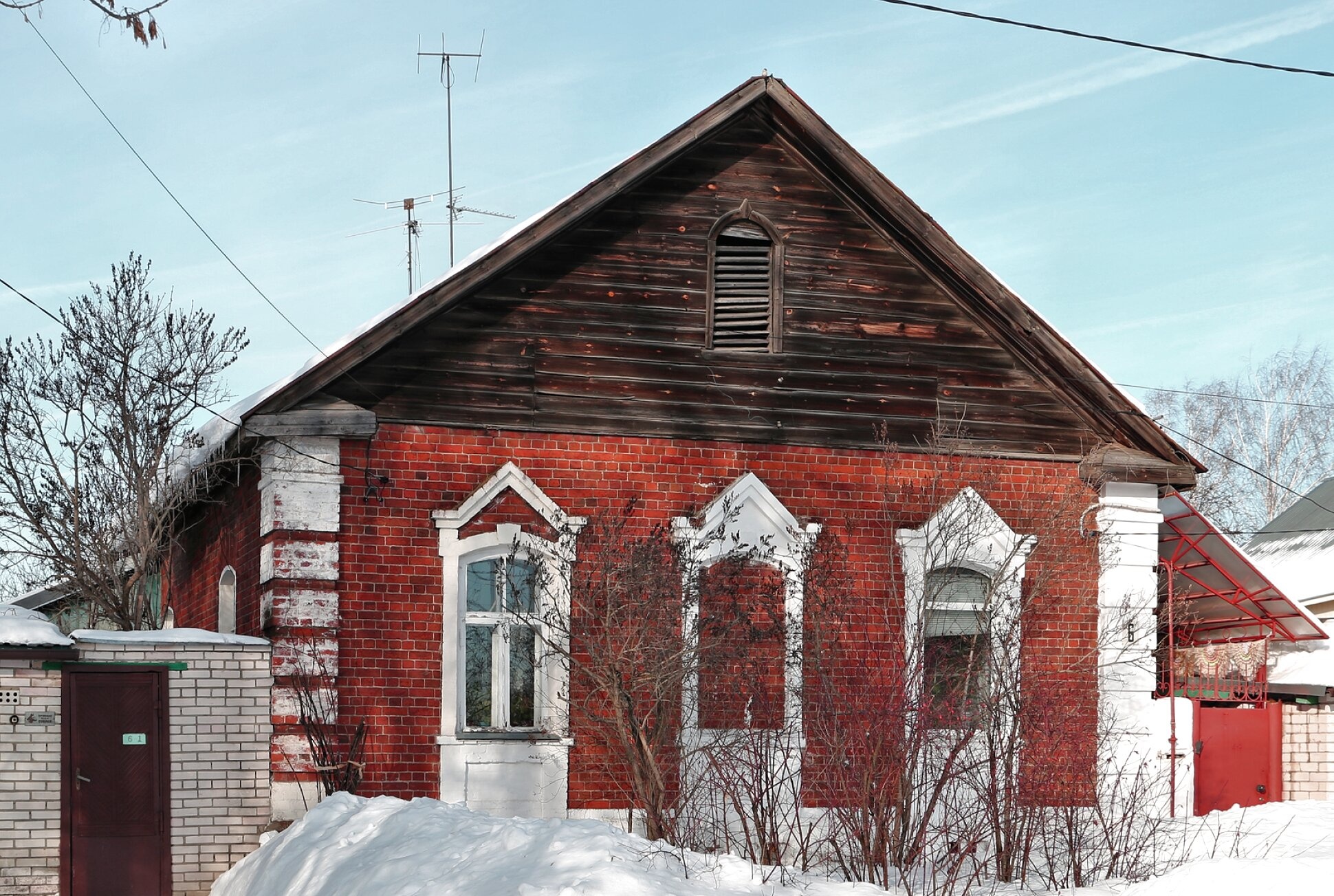 Здание храма представляет собой кирпичную однопрестольную церковь, построенную в традициях русской церковной архитектуры. На снимке хорошо просматривается основной объем здания с характерным для православных храмов завершением. Фронтонная часть выполнена из дерева, что свидетельствует о традиционных подходах в строительстве церковных сооружений.