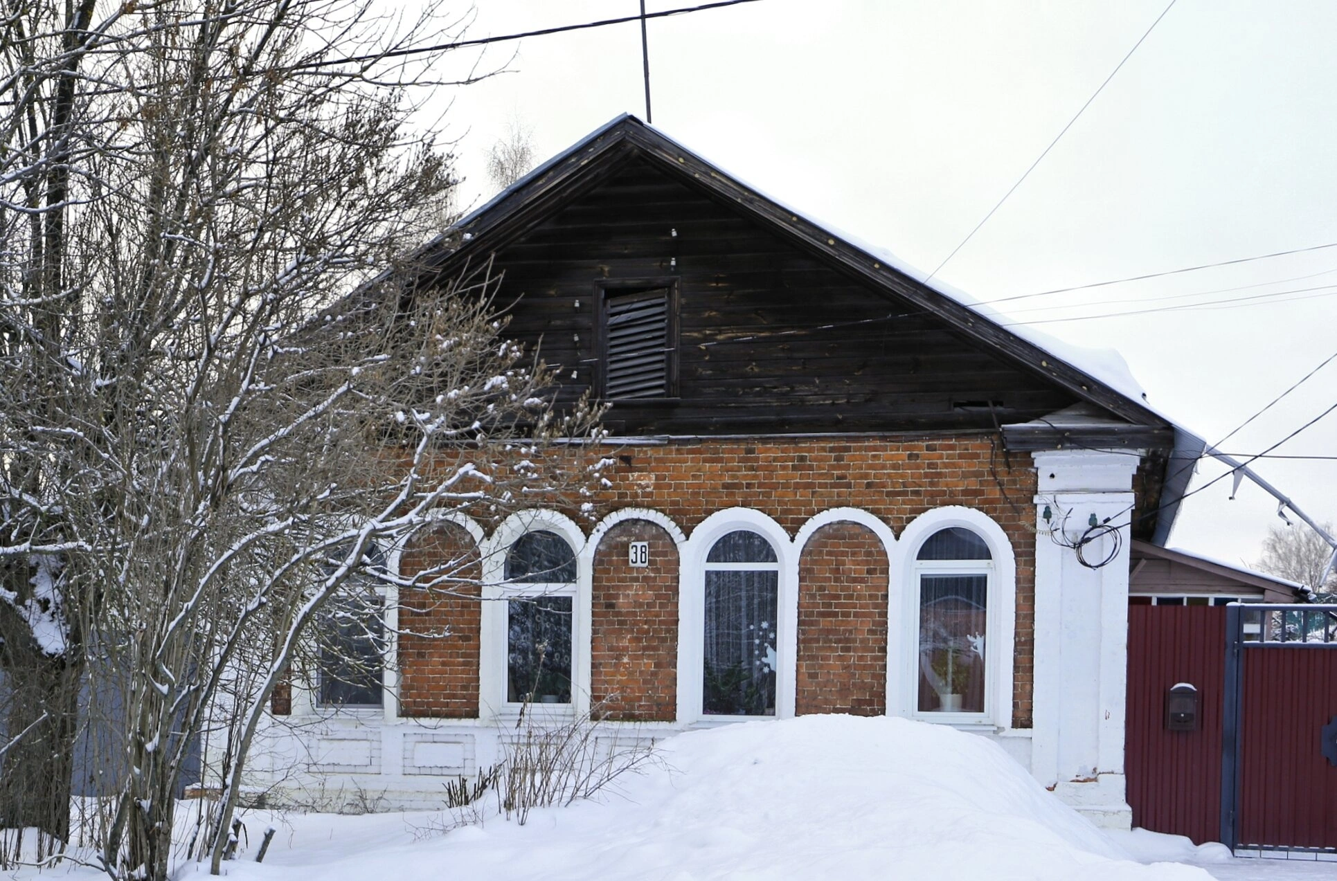 Фасад храма выполнен из красного кирпича и украшен четырьмя арочными оконными проемами с белыми наличниками. Между вторым и третьим окнами отчетливо виден номер дома — 38. Верхняя часть здания представляет собой деревянный мансардный этаж с темной обшивкой, увенчанный слуховым окном, оборудованным жалюзи. Двускатная крыша обильно покрыта снегом, подчеркивая зимнее время года.