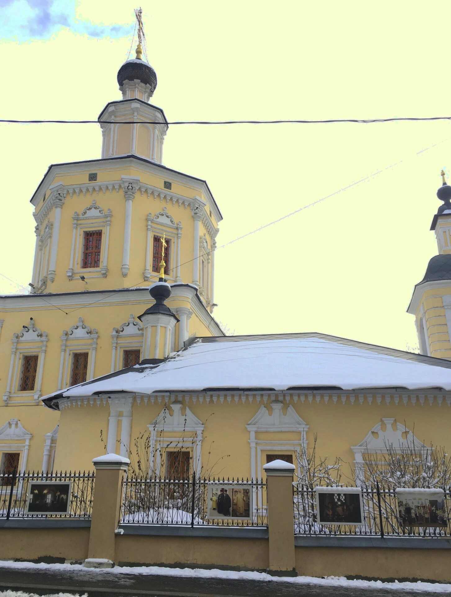 Архитектурный облик церкви представляет собой прекрасный образец московского барокко конца XVII века. Фасад здания окрашен в светлые тона, а белоснежные декоративные элементы — наличники окон, колонны и лепнина — создают изящный контраст. В правой части кадра видна колокольня с восьмигранным ярусом, увенчанная куполом и православным крестом, символизирующим победу жизни над смертью.