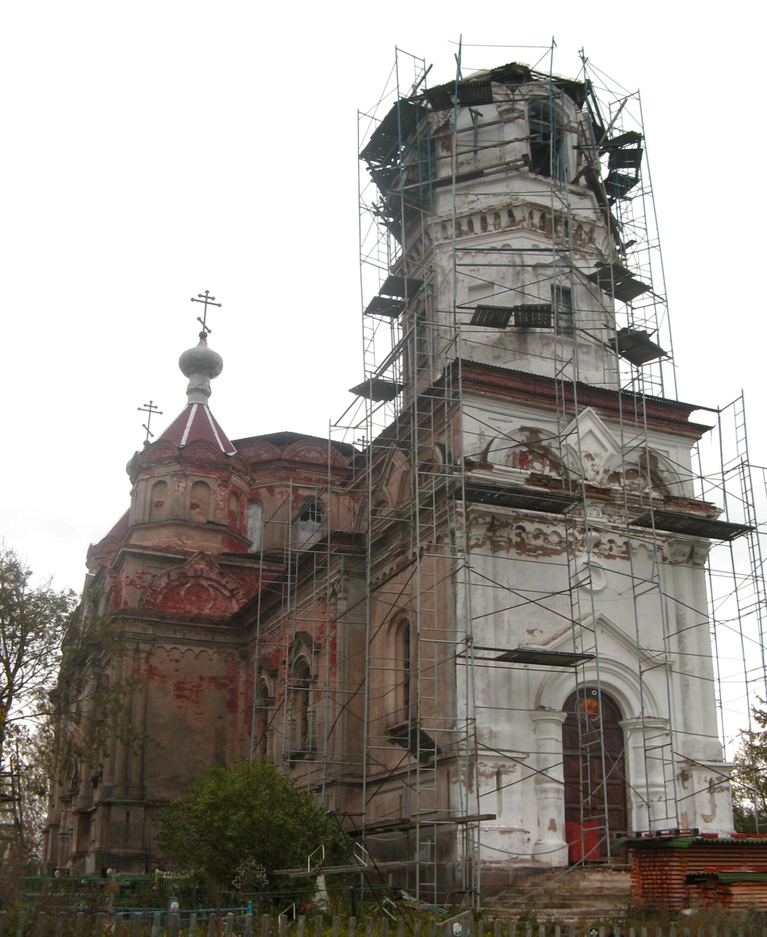На снимке отчётливо видна колокольня церкви, частично окружённая строительными лесами, что свидетельствует о активных восстановительных работах. Верхний ярус колокольни находится в процессе реконструкции или перестройки, целью которой является возвращение ему первоначального исторического облика. Основной объём каменного храма также несёт следы ремонтных работ, что вселяет надежду на скорое полное возрождение святыни.