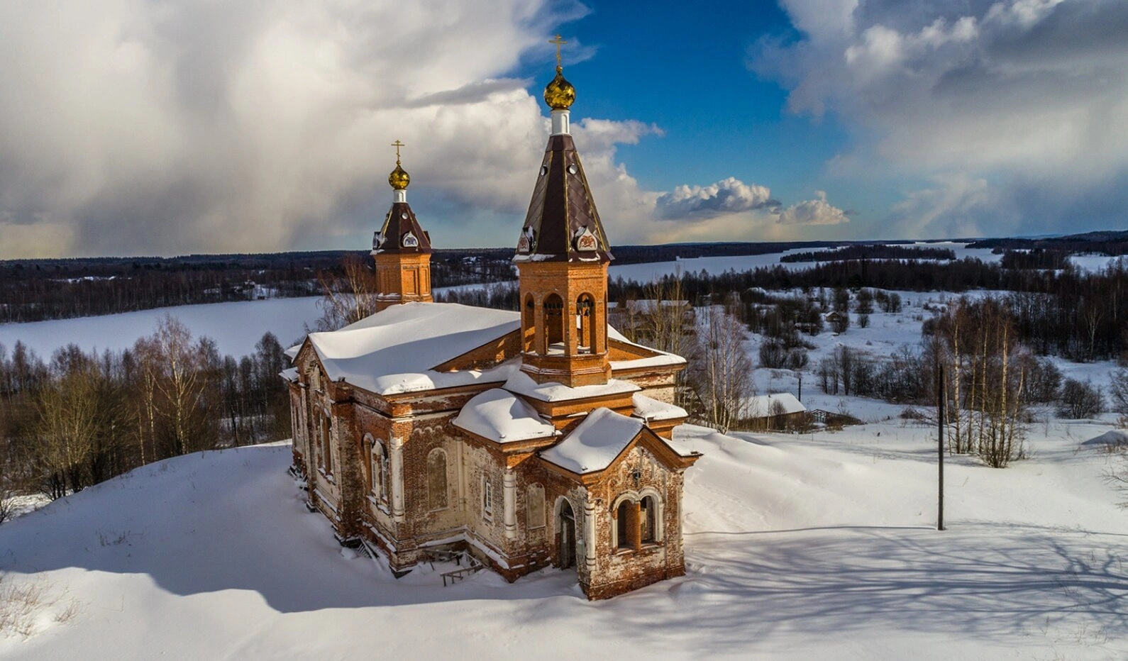 На представленной фотографии запечатлена Церковь Живоначальной Троицы, расположенная в селе Кончезеро Кондопожского района Республики Карелия. Храм возвышается на заснеженном холме, демонстрируя величественный образец церковной архитектуры Русского Севера.