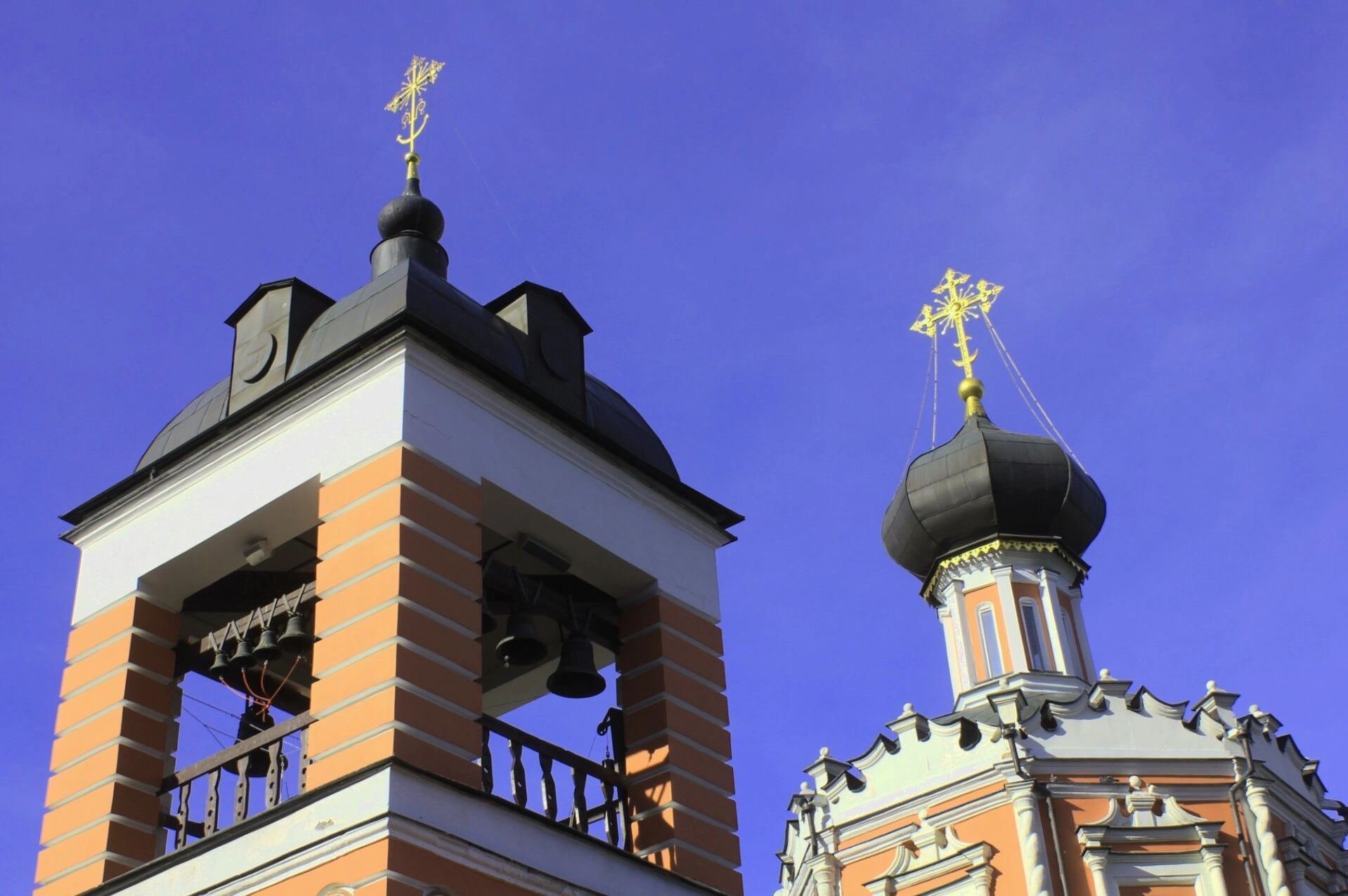 На представленной фотографии запечатлены колокольня и главный купол старинного православного храма — Церкви Троицы Живоначальной в Конькове, что расположена в Москве на Профсоюзной улице. Снимок позволяет рассмотреть величественную архитектуру святого места, выполненную в традиционном русском стиле.